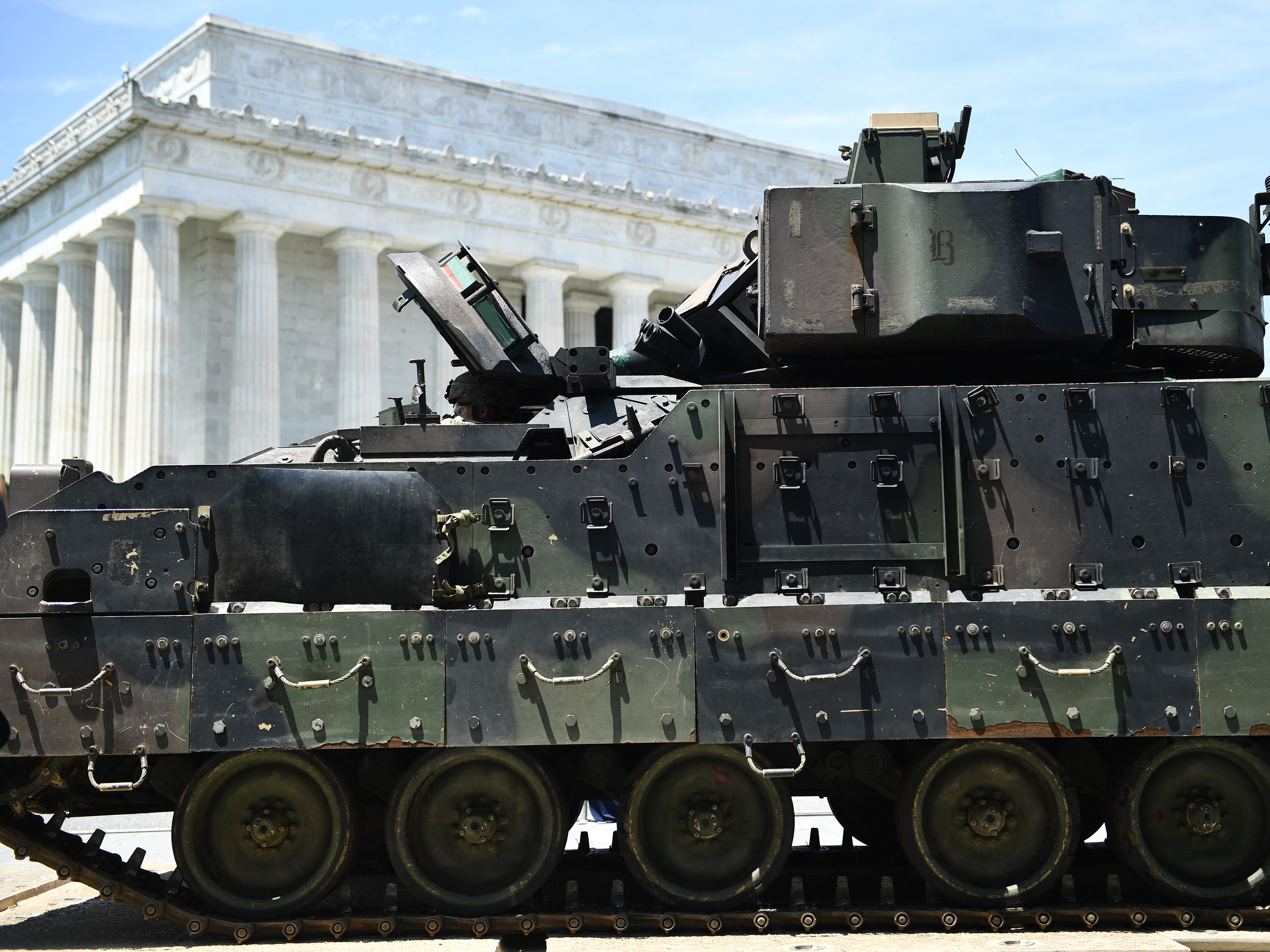 A Bradley Fighting Vehicle at the Lincoln Memorial on the National Mall in Washington, DC, July 3, 2019. It was part of President Trump's "Salute to America" Fourth of July celebration. He has expressed interest in a military parade since his first term. (AFP via Getty Images)