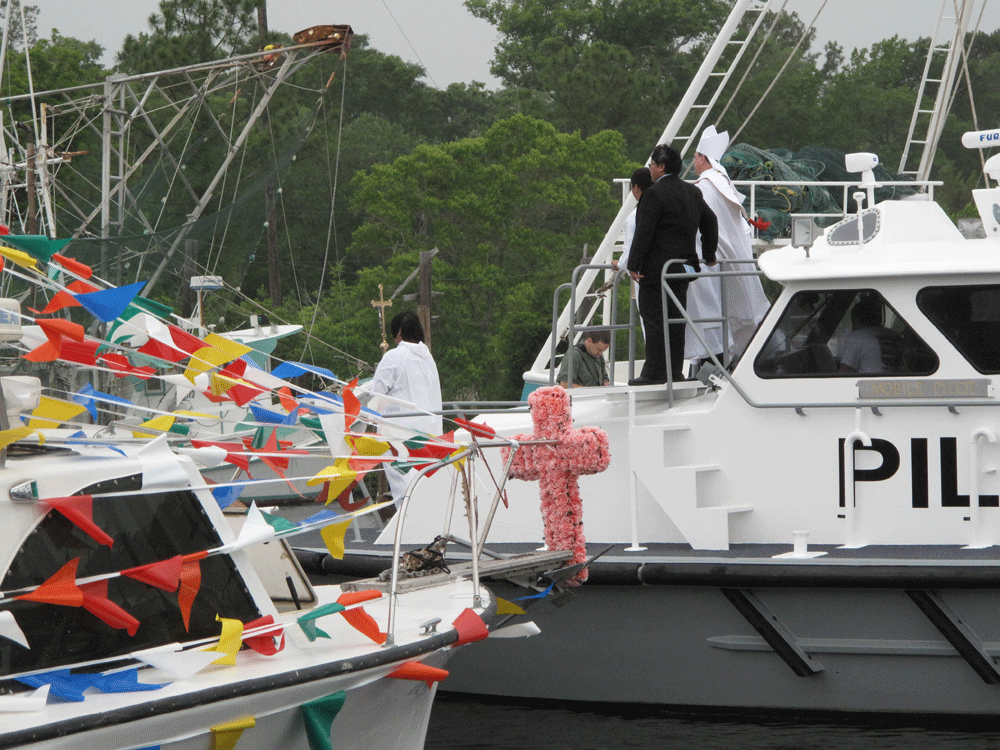 Support WBURGulf Town Asks God To Protect Its LivelihoodsPlay04:49Download AudioDebbie ElliottMay 03, 2010 ShareArchbishop of Mobile Thomas Rodi blesses the fleet in Bayou La Batre Sunday. He asked God to bless those who are working to contain and to stop the oil leak. (NPR)