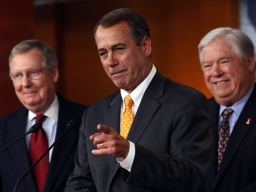 House Minority Leader John Boehner answers questions from reporters at the Capitol with Senate Minority Leader Mitch McConnell (left) and Mississippi Gov. Haley Barbour on Wednesday. Following Tuesday's midterms, Republicans stand ready to take control of the House of Representatives, with Boehner likely becoming the next speaker. (Getty Images)