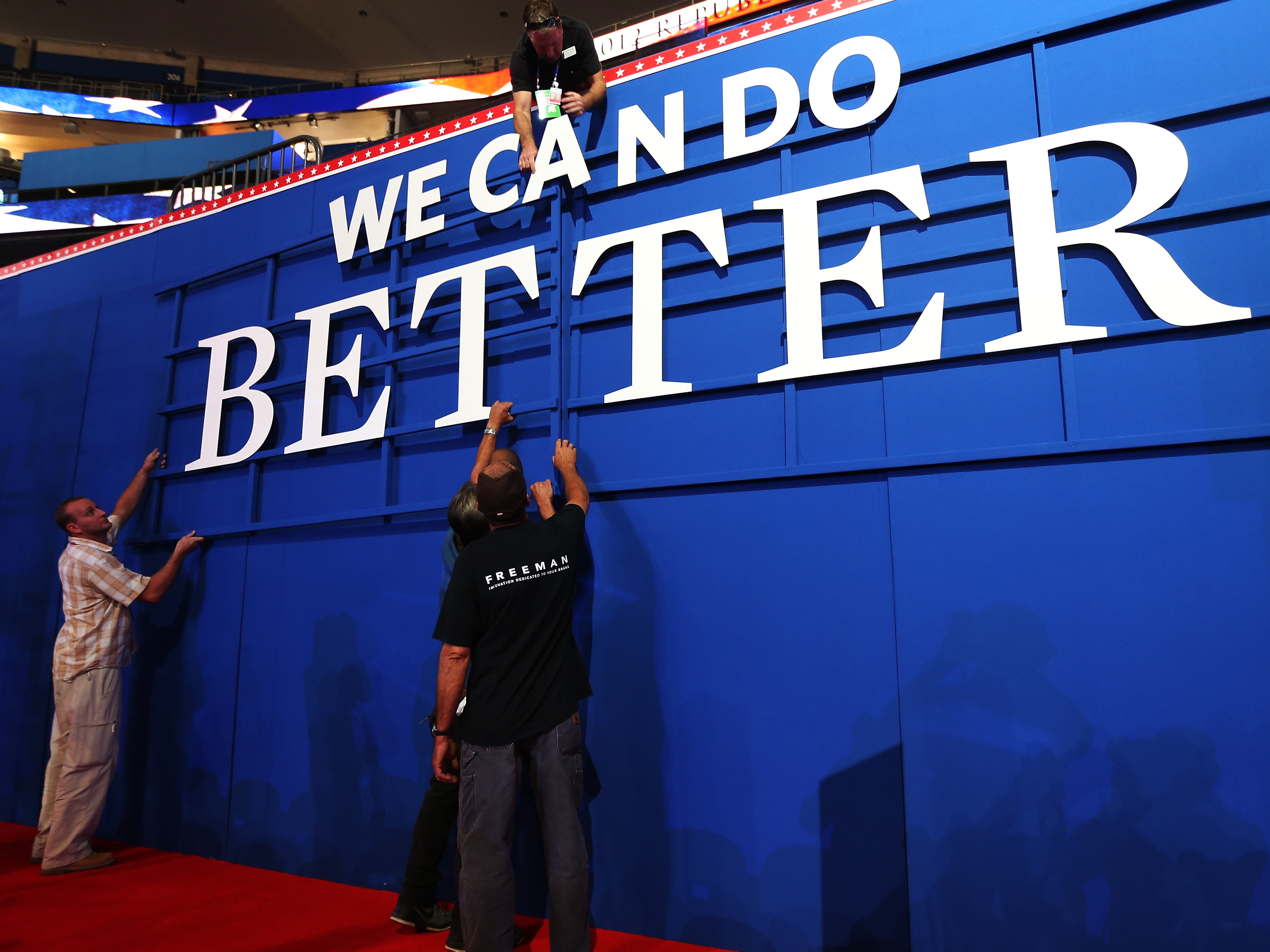 The Republican message: Workers were putting up a sign Sunday inside the Tampa Bay Times Forum, where the 2012 Republican National Convention is set to begin. (Getty Images)