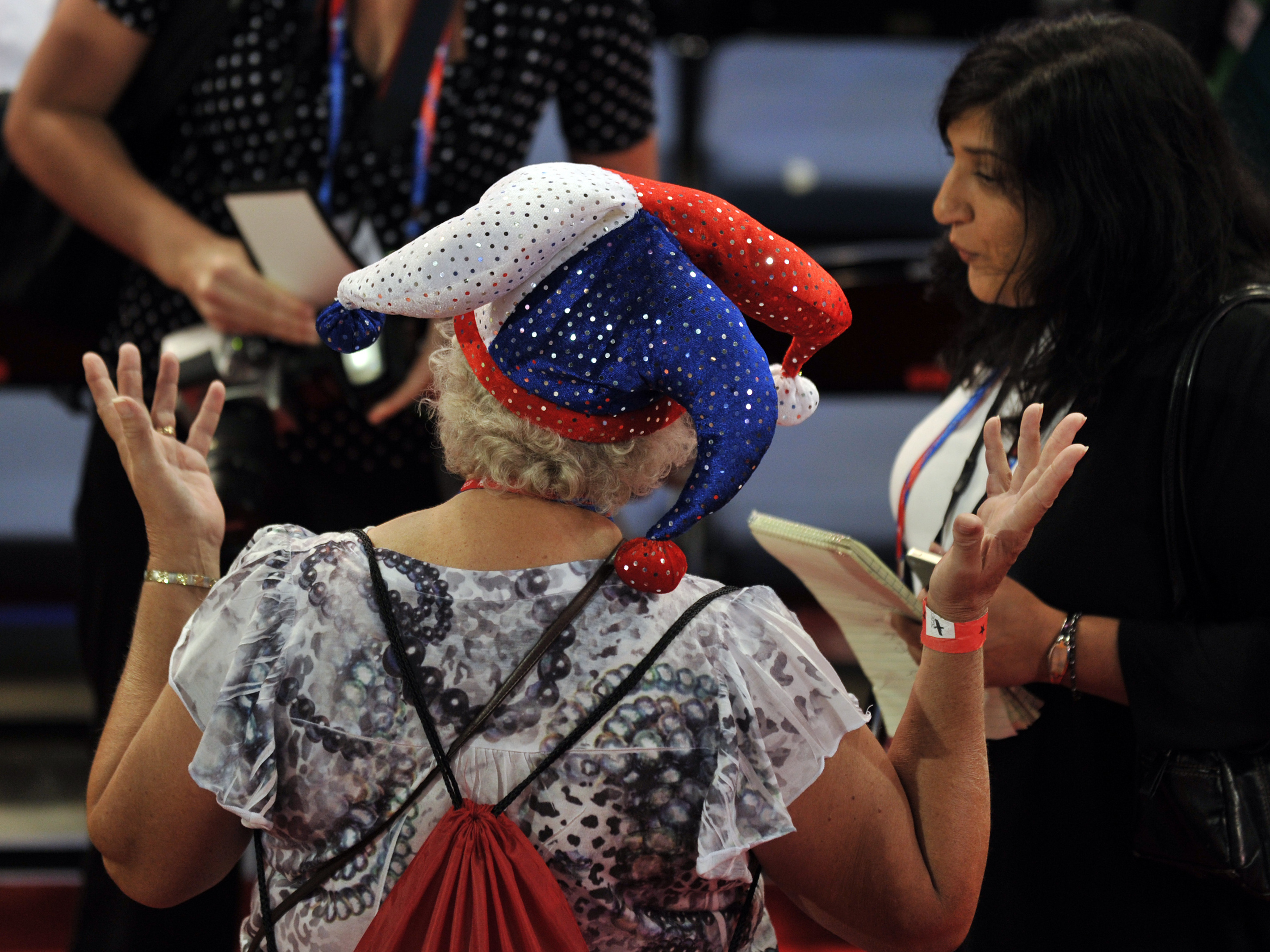 Support WBUROpinionRomney's Forces Are In Control For Now, But Maybe Not For LongRon ElvingAugust 28, 2012 ShareIn Tampa Tuesday, a colorfully dressed delegate spoke to reporters on the floor of the Republican National Convention. (AFP/Getty Images)