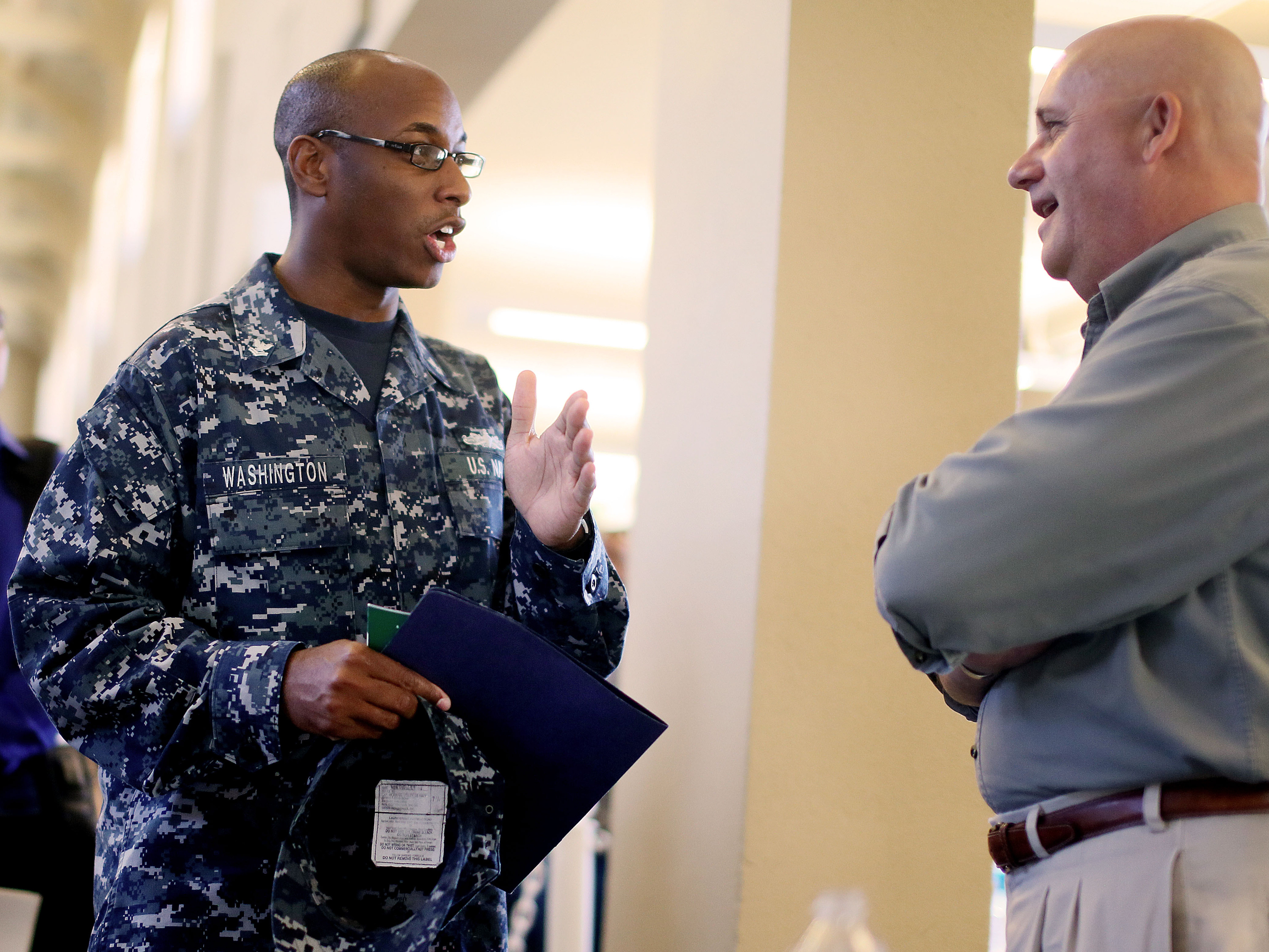 Support WBURJust 96,000 Jobs Added To Payrolls; Unemployment Rate Dips To 8.1 PercentMark MemmottSeptember 07, 2012 ShareAt a job fair in San Diego this week, Navy Sailor E-5 Cedric Washington spoke to Sim Garriotti from Lockheed Martin while interviewing for a potential position. (Getty Images)