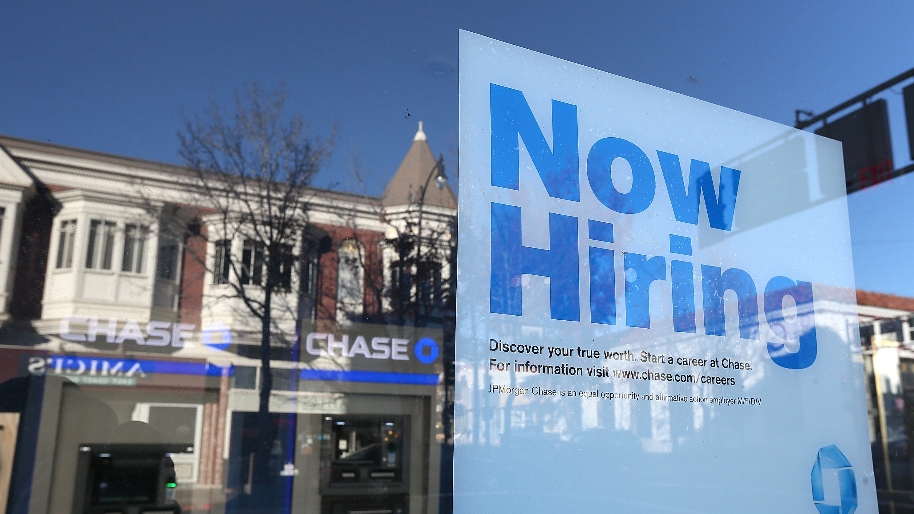 Hoping to see more of these: A "now hiring" sign in the window of a bank in San Rafael, Calif., in January. (Getty Images)