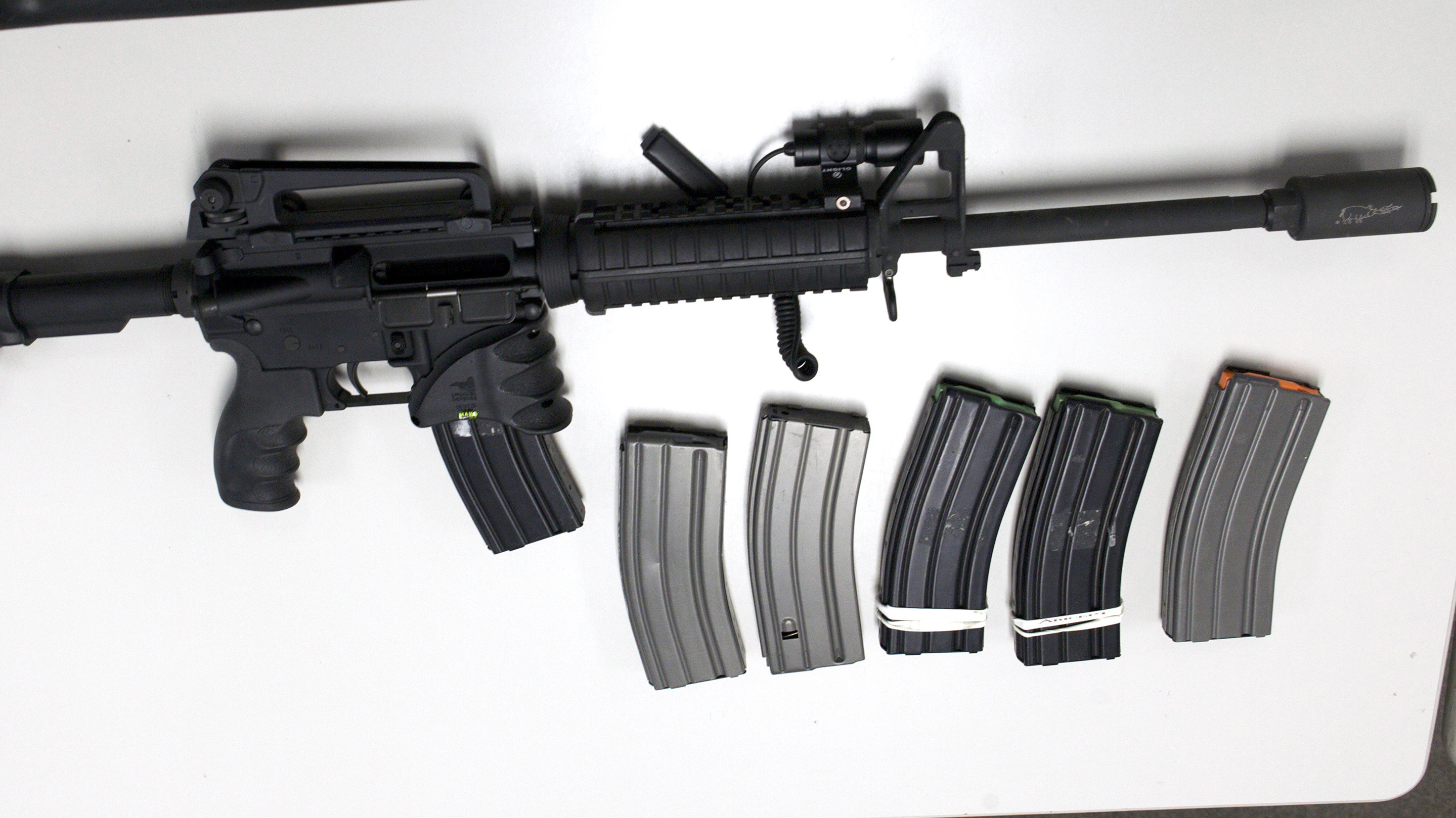 A Bushmaster rifle, similar to the type used by Adam Lanza during the shooting at Sandy Hook Elementary School, and some ammunition magazines. The sale and possession of this type of weapon, and high-capacity magazines, will be severely restricted in Connecticut under new legislation. (Reuters /Landov)