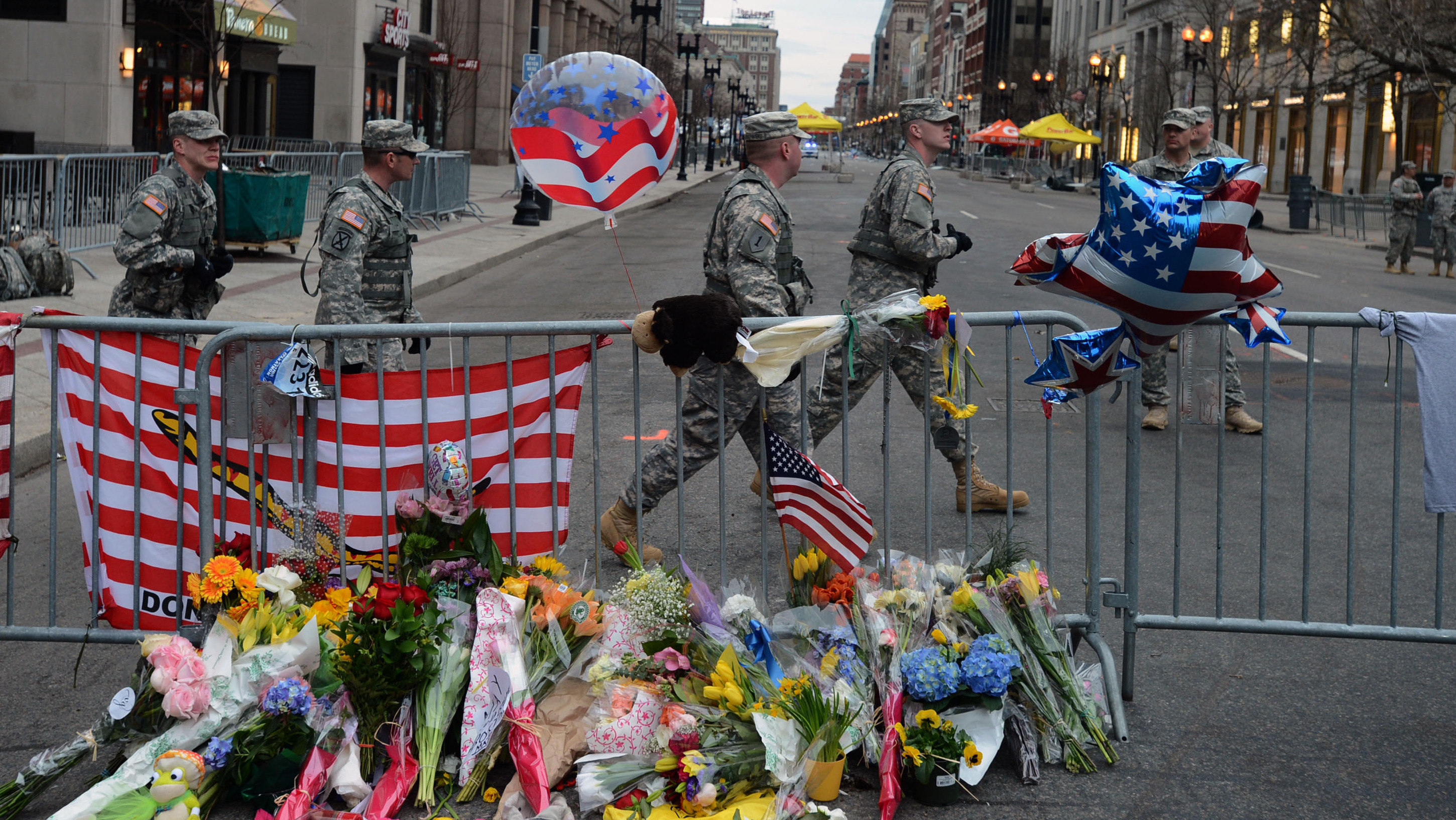 Flowers, flags and balloons at a memorial in Boston near the site of Monday's explosions. (Xinhua /Landov)