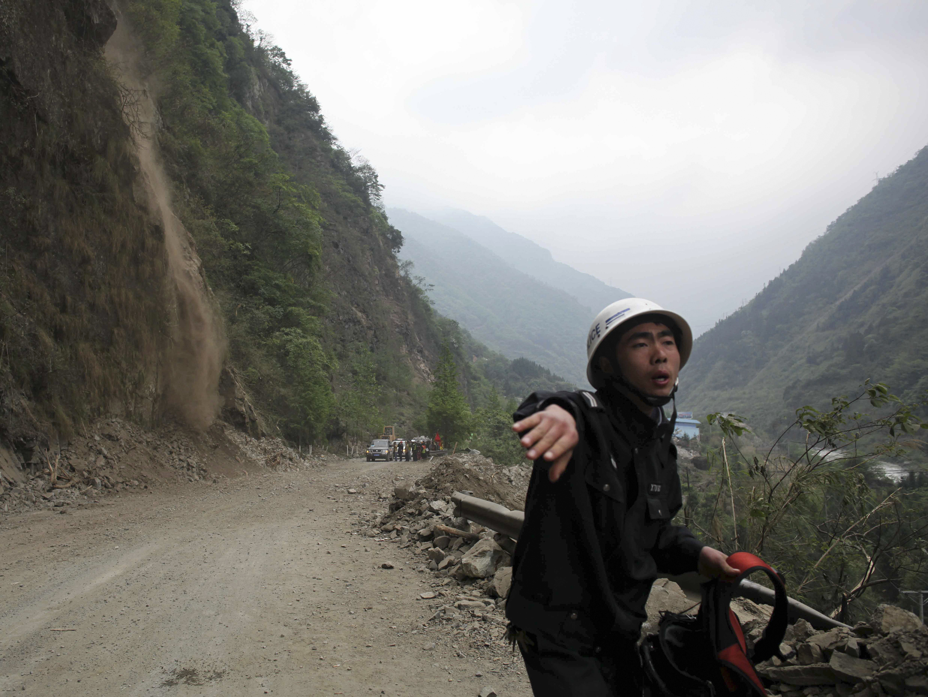 As rocks and dirt tumble down a mountainside (at left), a police officer urges people to stay back on a road in Baoxing county, Sichuan province, on Monday. Rescuers are having a hard time getting to victims of Saturday's strong earthquake because of aftershocks and landslides. (Reuters /Landov)