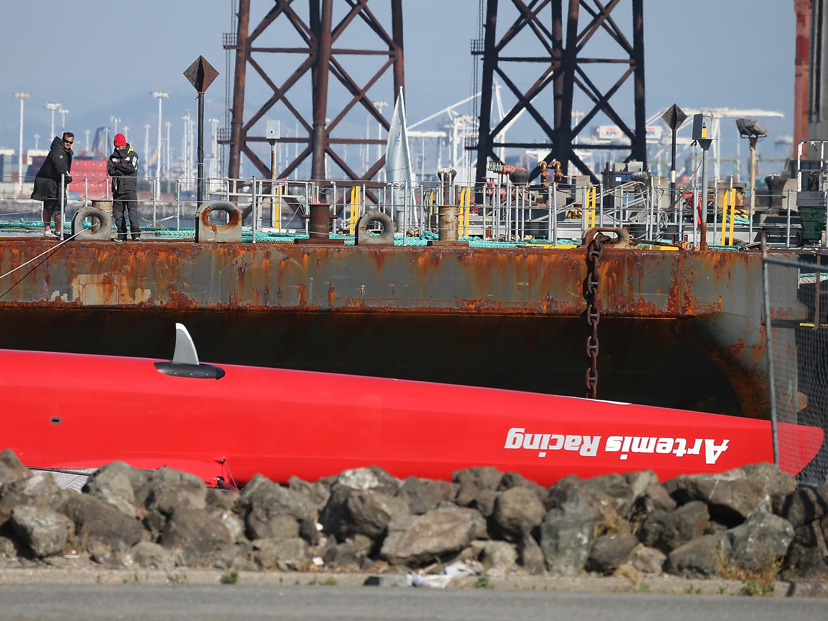 Support WBUROlympic Sailor Killed In Capsize Of America's Cup RacerScott NeumanMay 09, 2013 ShareAn upside-down hull of the Artemis Racing AC72 catamaran after being towed in to Treasure Island on Thursday. (Getty Images)