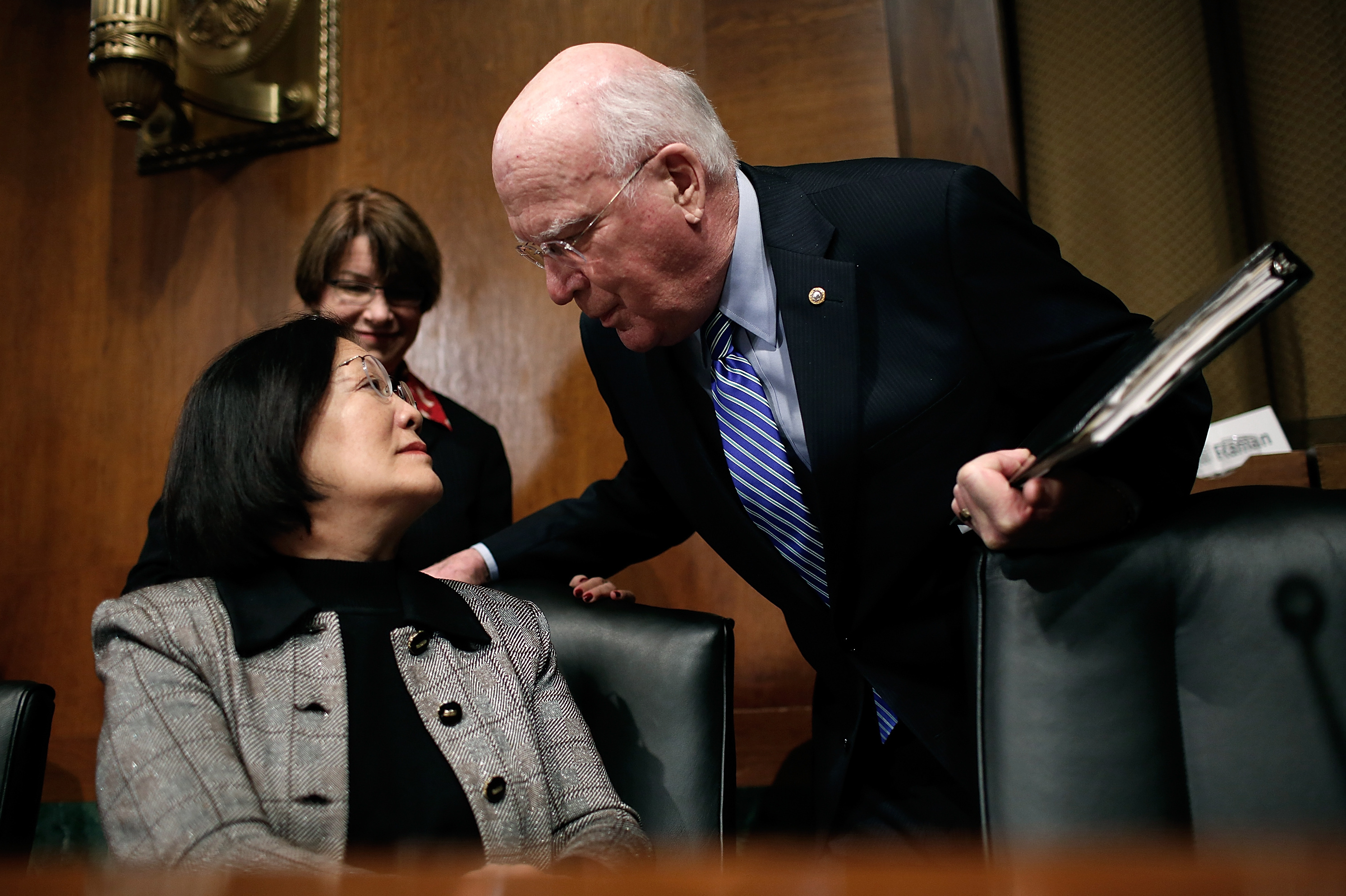 Support WBURLawmakers Look To Prevent More Target-Sized Data BreachesPlay03:55Download AudioElise HuFebruary 04, 2014 ShareSen. Patrick Leahy chats with Sen. Mazie Hirono before hearing from retail company executives on Tuesday. (Getty Images)