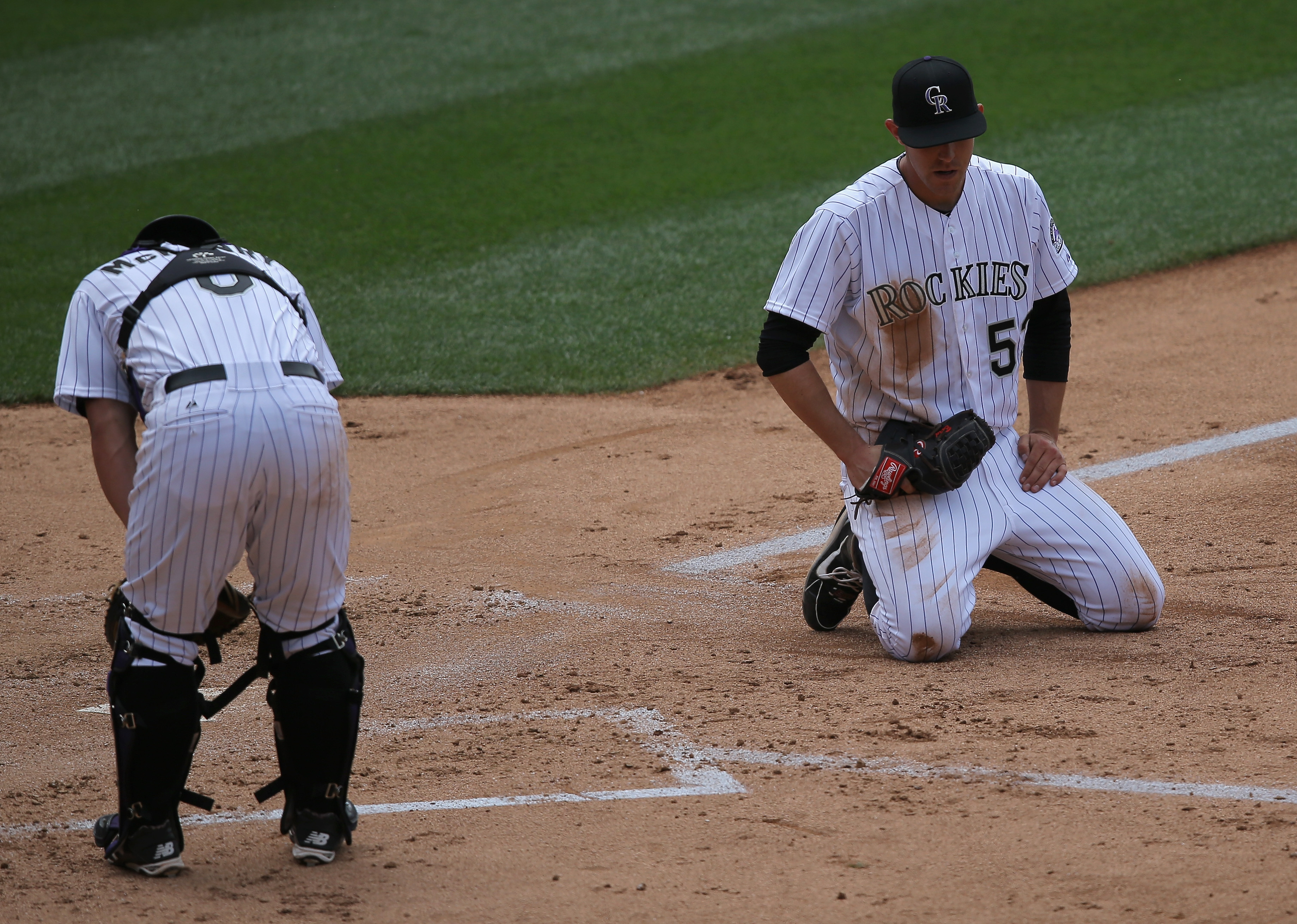 Support WBURThe Rockies' Very Bad Day: When A Wild Pitch Clears The BasesEyder PeraltaJune 22, 2014 ShareStarting pitcher Christian Friedrich and catcher Michael McKenry of the Colorado Rockies collect themselves after they allowed three runs to score on a wild pitch. (Getty Images)