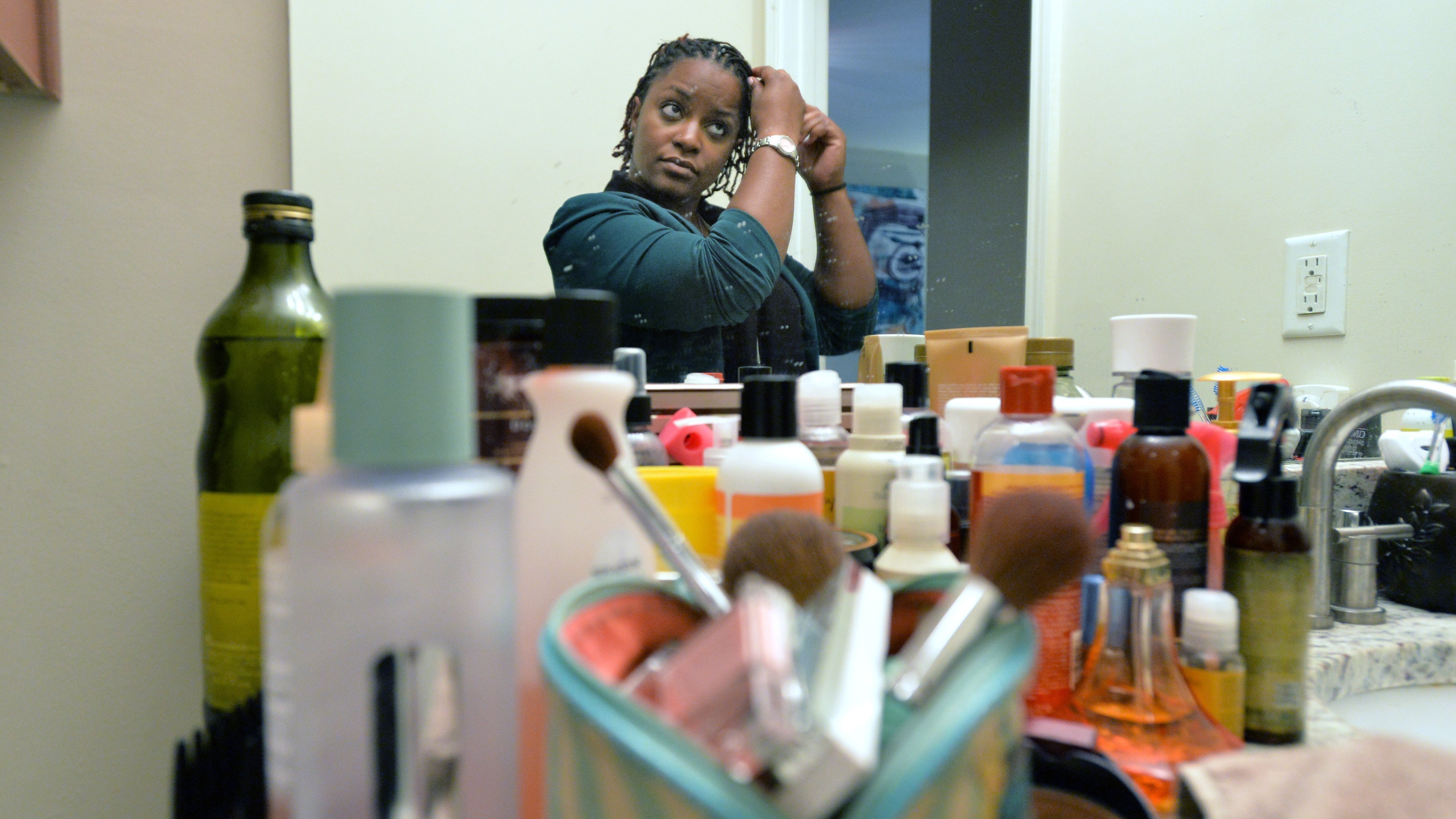 Georgia National Guard Sgt. Jasmine Jacobs uses many hair products to do her daily hair treatment at her home in Atlanta on April 2. Jacobs railed against a military policy that placed heavy restrictions on how women could wear their hair. The policy has been overturned by Defense Secretary Chuck Hagel. (MCT/Landov)