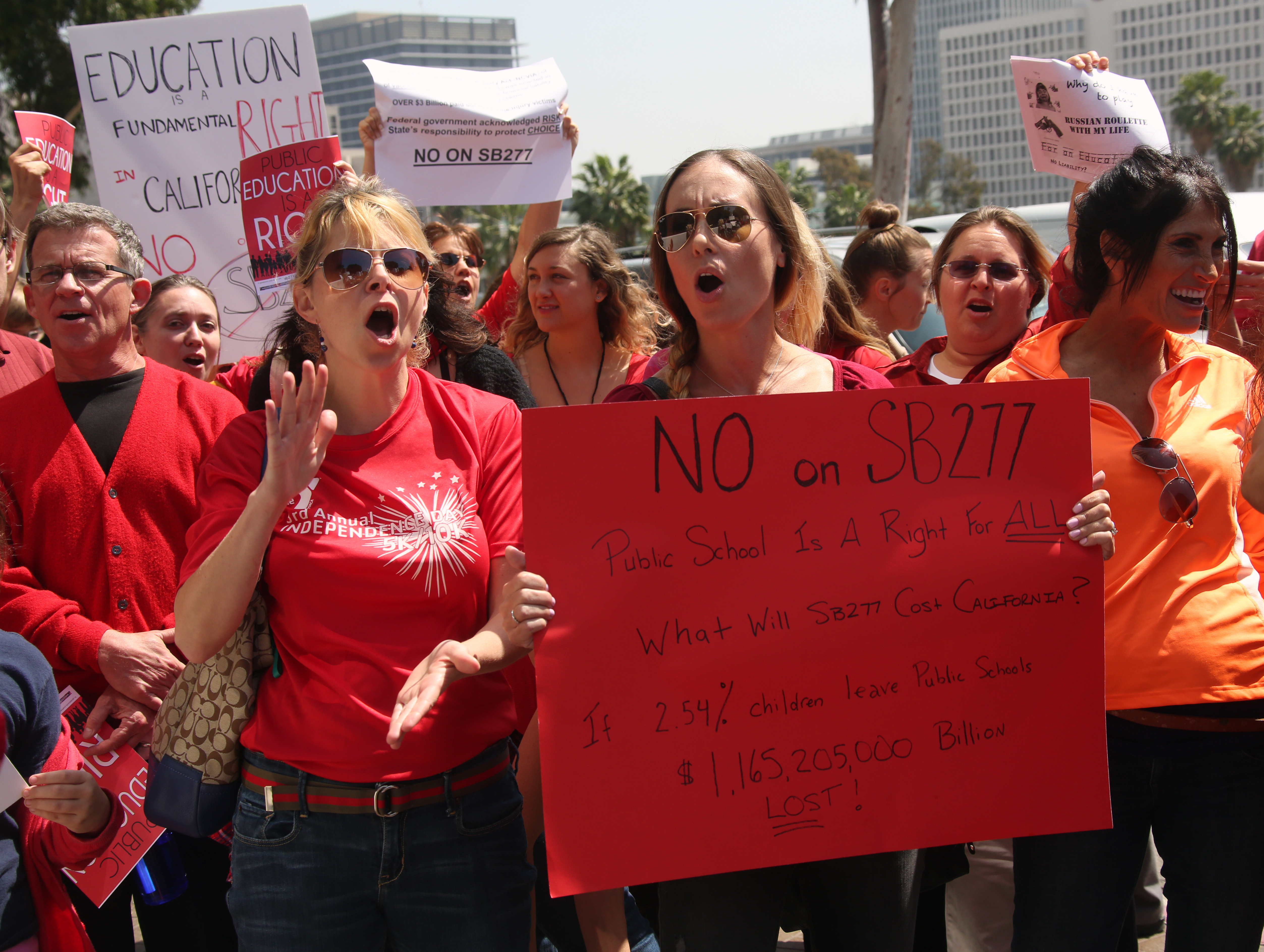 Support WBURCalifornia Legislature Passes 'Mandatory' Vaccine Bill, Sends It To The GovernorLucy PerkinsJune 29, 2015 ShareParents and teachers who oppose efforts to end the personal belief exemption on vaccinations rally in Los Angeles on April 14. (LA Times via Getty Images)