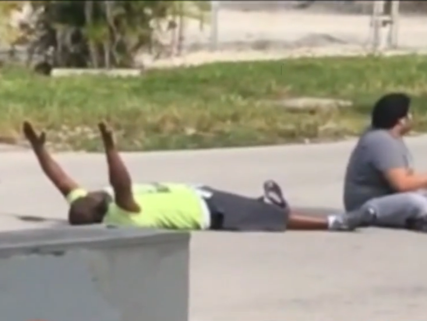 In a video filmed on Monday, Charles Kinsey (left) lies next to the autistic patient he was trying to help, holding his hands up in an effort to assure the North Miami police that they aren't a threat. Kinsey was later shot in the leg by the police. (Channel 7 WSVN/Screenshot by NPR)