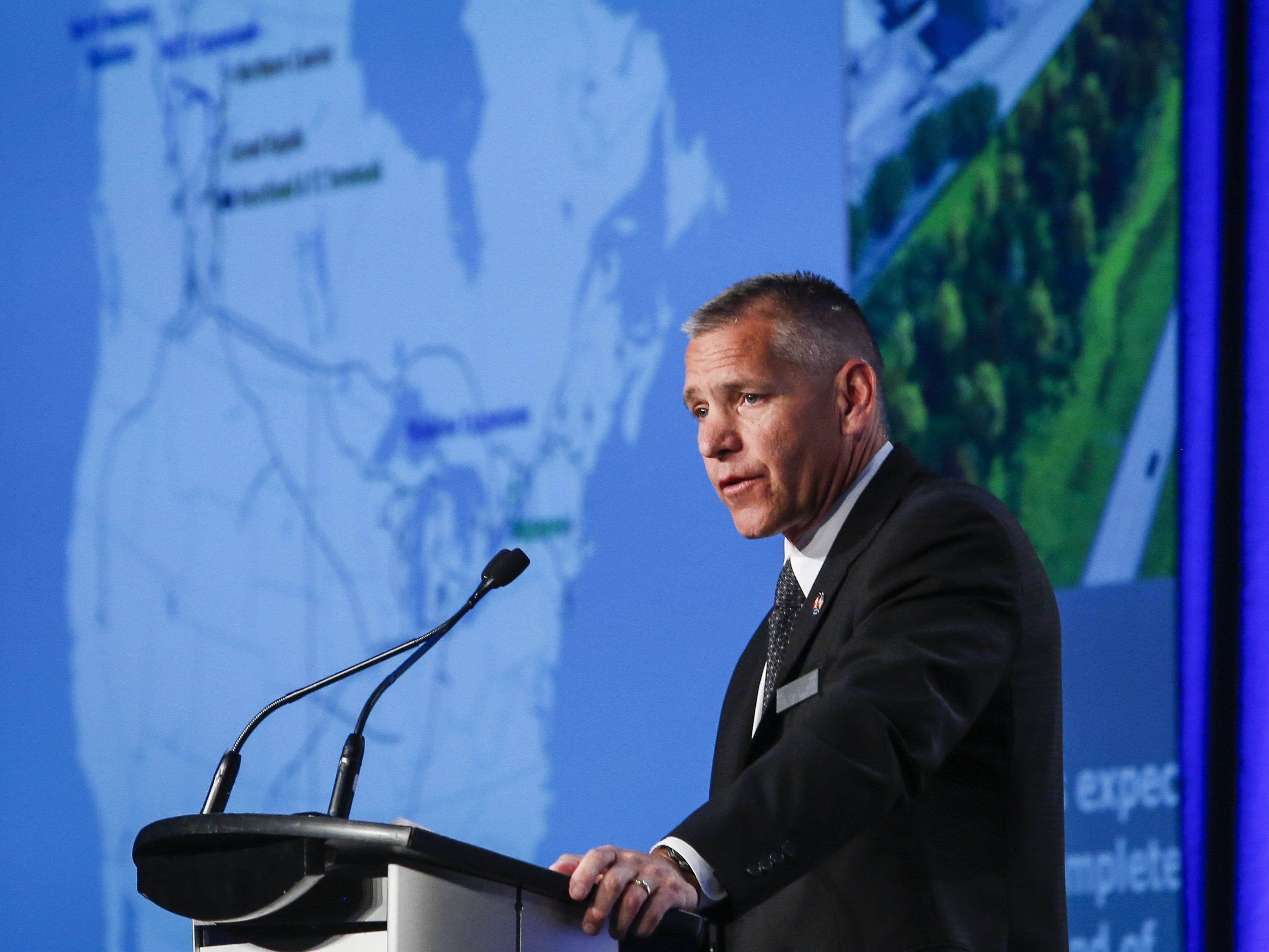 Support WBURAs Trump Reboots Pipeline Expansion, An Unexpected Delay EmergesMarie CusickJanuary 28, 2017 ShareRuss Girling, president and CEO of TransCanada Corporation, addresses the company's annual meeting in 2015 in Calgary, Alberta. (The Canadian Press)