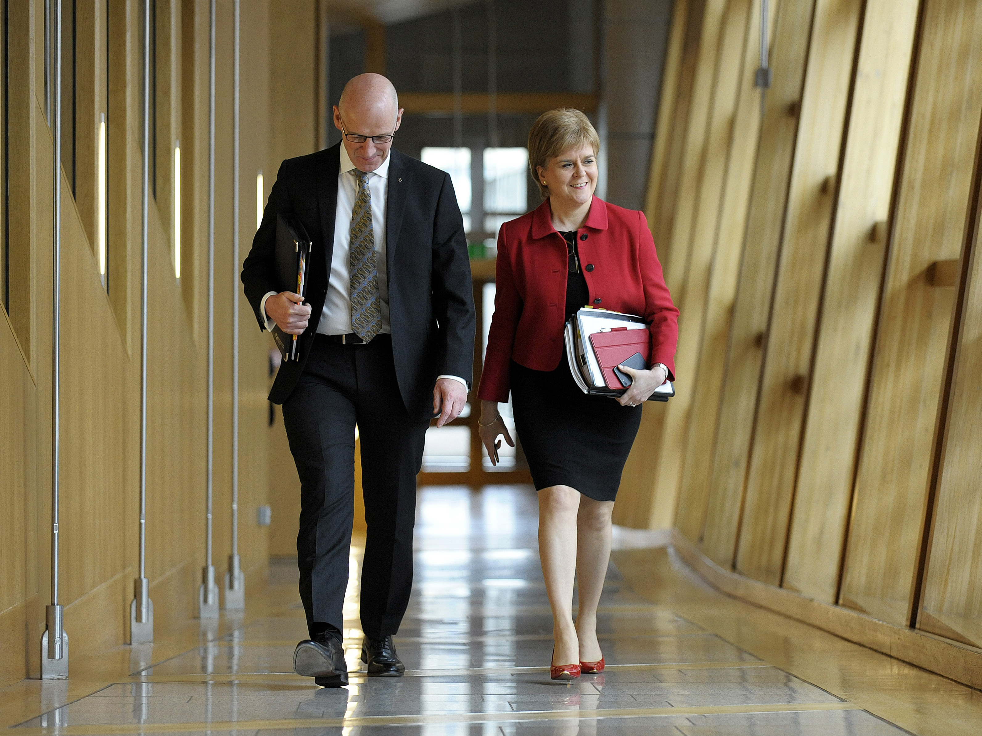 Scottish First Minister Nicola Sturgeon and Deputy First Minister John Swinney arrive at Scottish Parliament on Tuesday. They attended the second day of debate on a motion that ultimately granted Sturgeon the authority to pursue an independence referendum. (AFP/Getty Images)