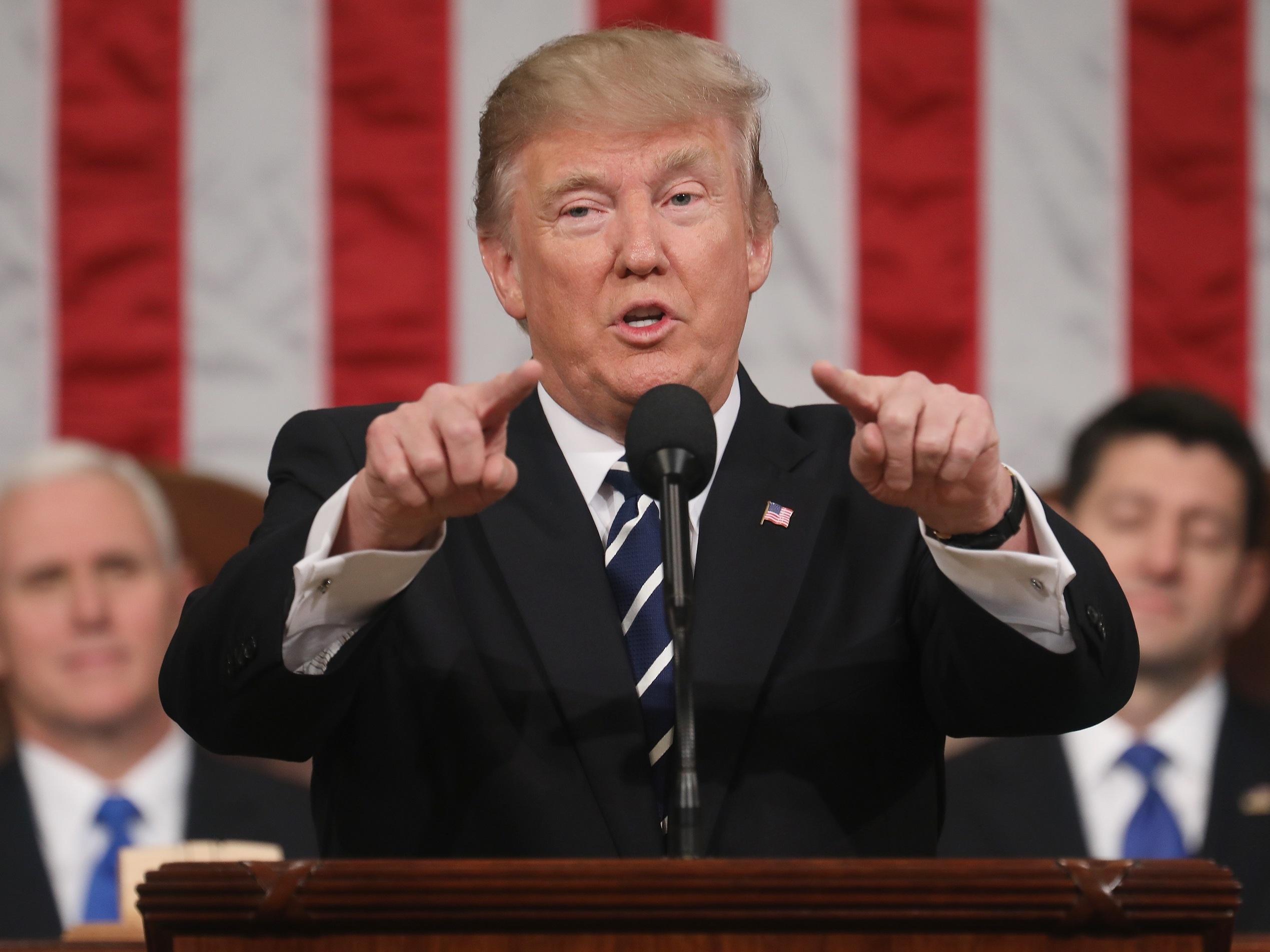 President Donald J. Trump (C) delivers his first address to a joint session of the U.S. Congress as U.S. Vice President Mike Pence (L) and Speaker of the House Paul Ryan (R) listen on February 28, 2017, in the House chamber of the U.S. Capitol in Washington, D.C. (Getty Images)