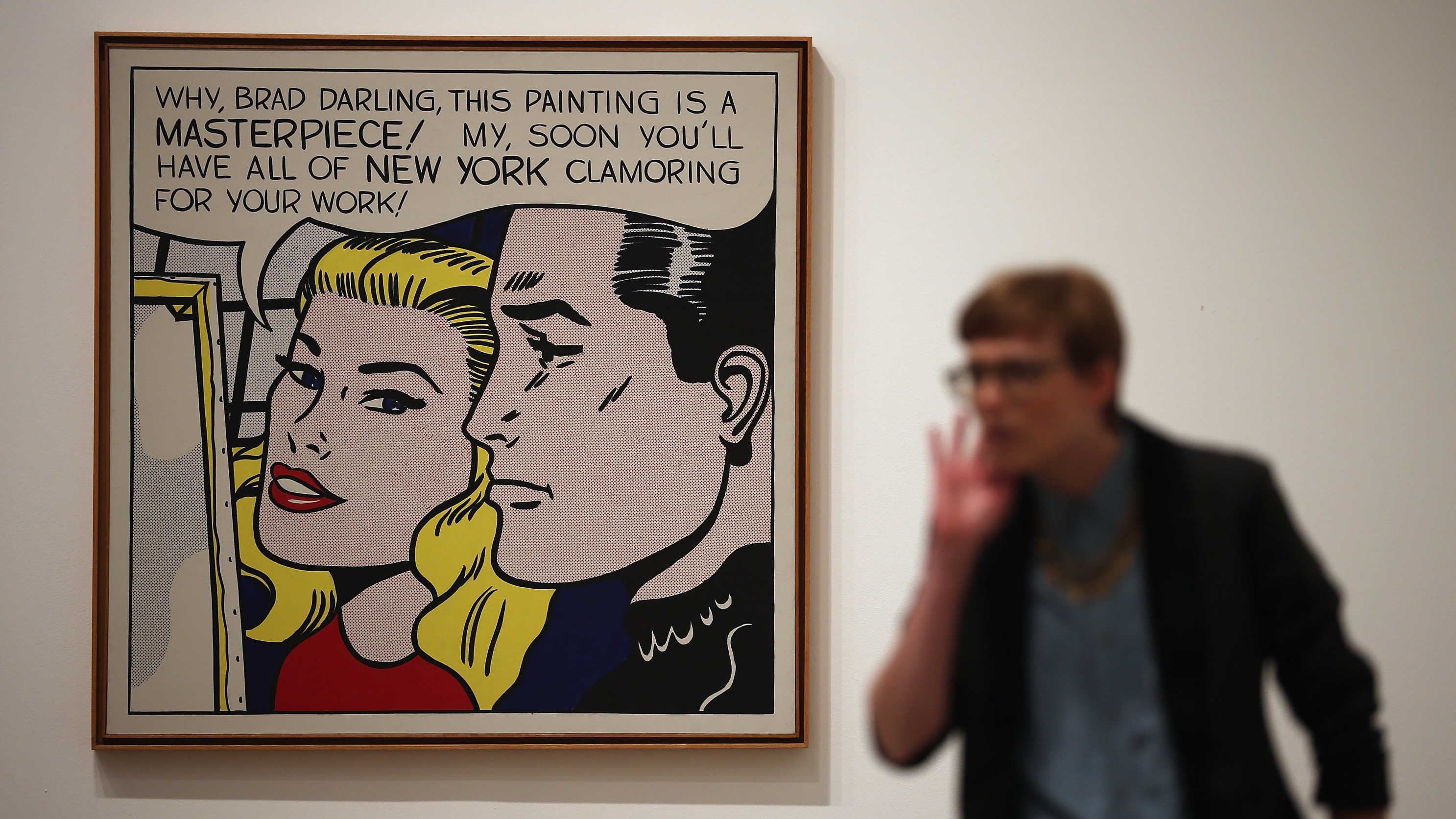 A visitor stands in front of Masterpiece during a press preview of "Lichtenstein, a Retrospective" at the Tate Modern in London in 2013. The iconic painting was owned by Agnes Gund, who recently sold it to fund a new criminal justice reform fund. (Getty Images)