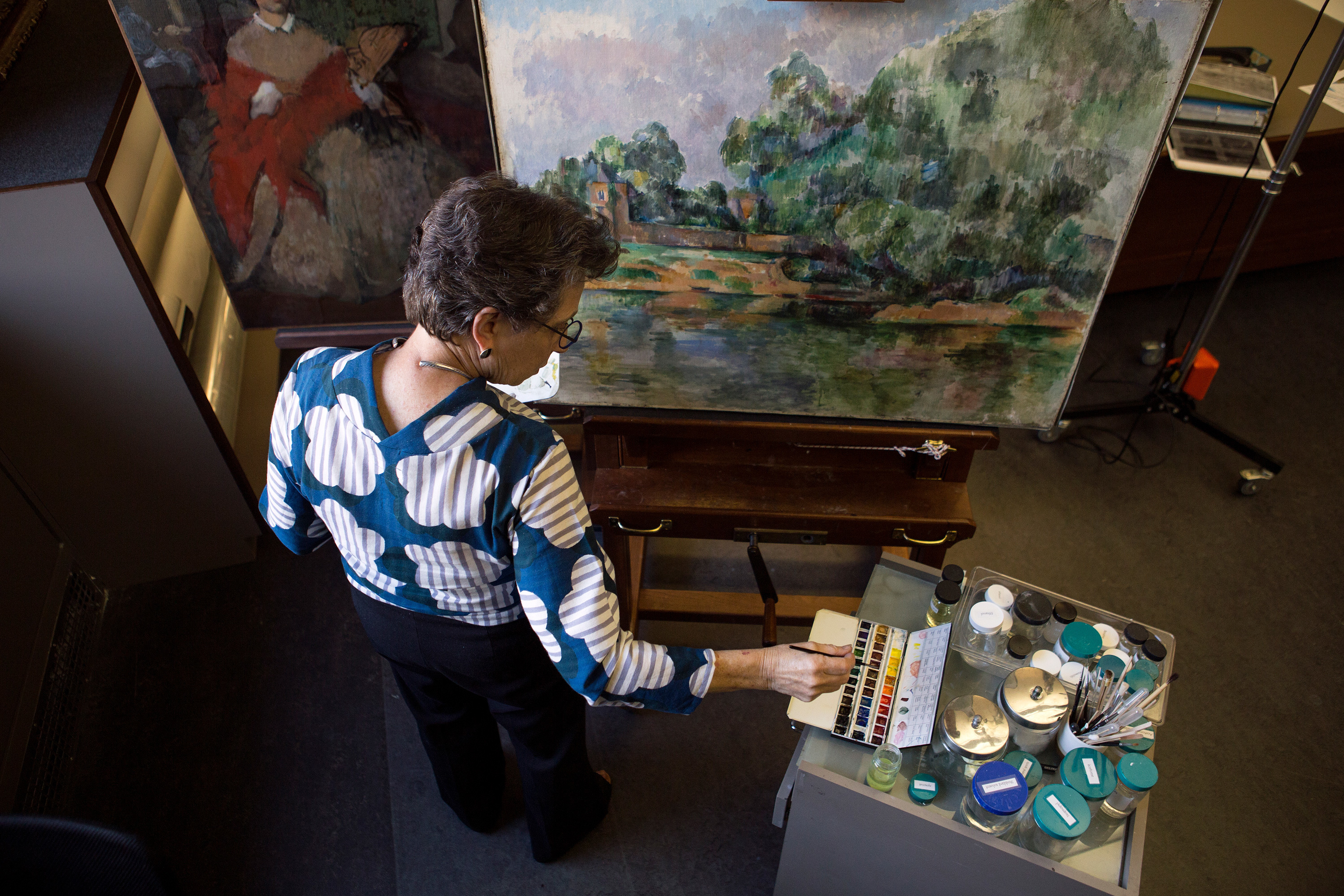 Support WBURWith Chemistry And Care, Conservators Keep Masterpieces Looking Their BestPlay07:09Download AudioSusan StambergJune 27, 2017 ShareSenior conservator of paintings Ann Hoenigswald works to fill in elements of Paul Cézanne's Riverbank c. 1895 in the National Gallery of Art's Paintings Conservation Lab in Washington, D.C. (NPR)