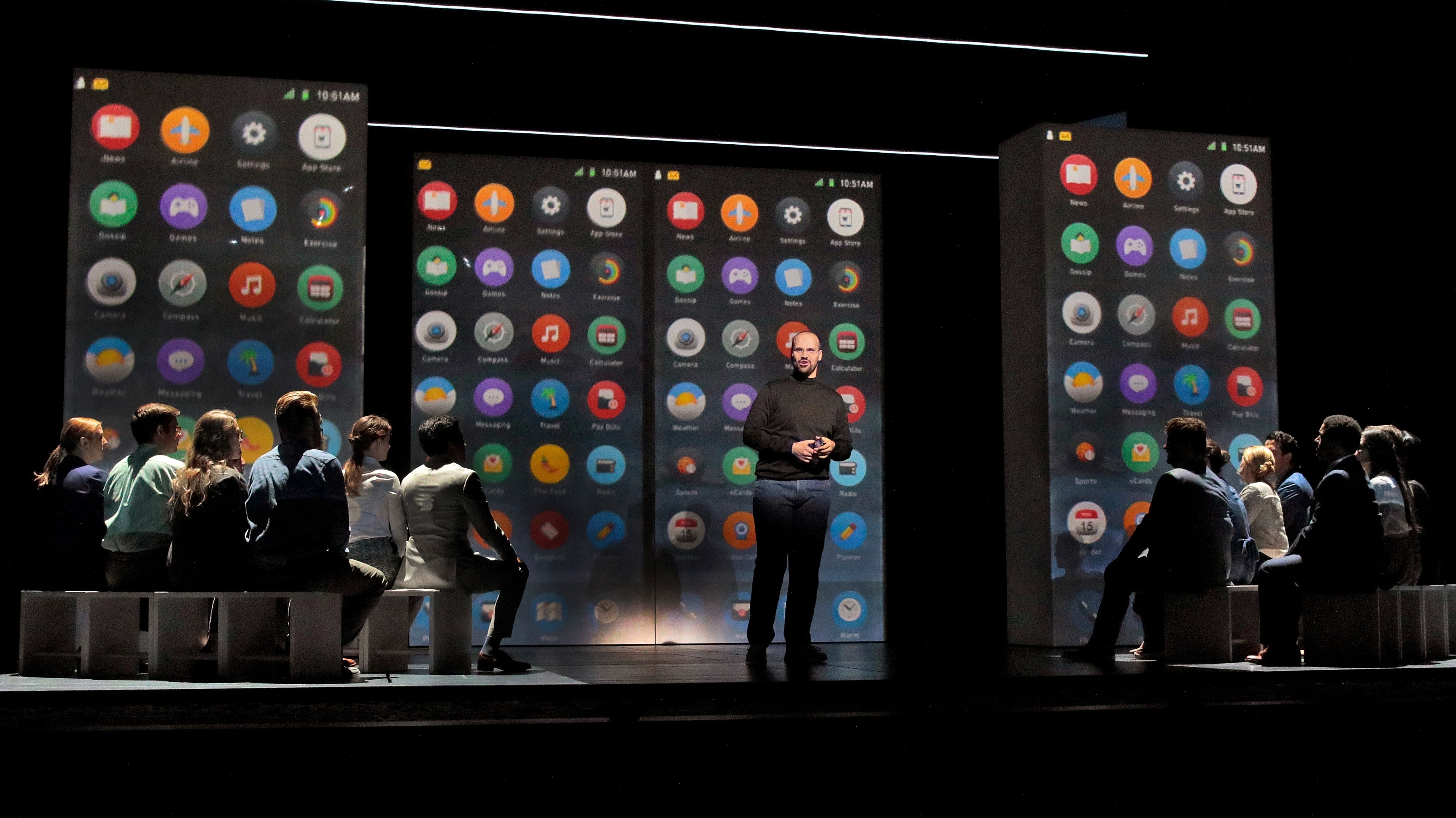Support WBURSing Different: Steve Jobs' Life Becomes An OperaPlay05:30Download AudioNaomi LewinJuly 22, 2017 ShareEdward Parks, who plays Steve Jobs, and the Santa Fe Opera Chorus in The (R)evolution of Steve Jobs. (Courtesy of the Santa Fe Opera)