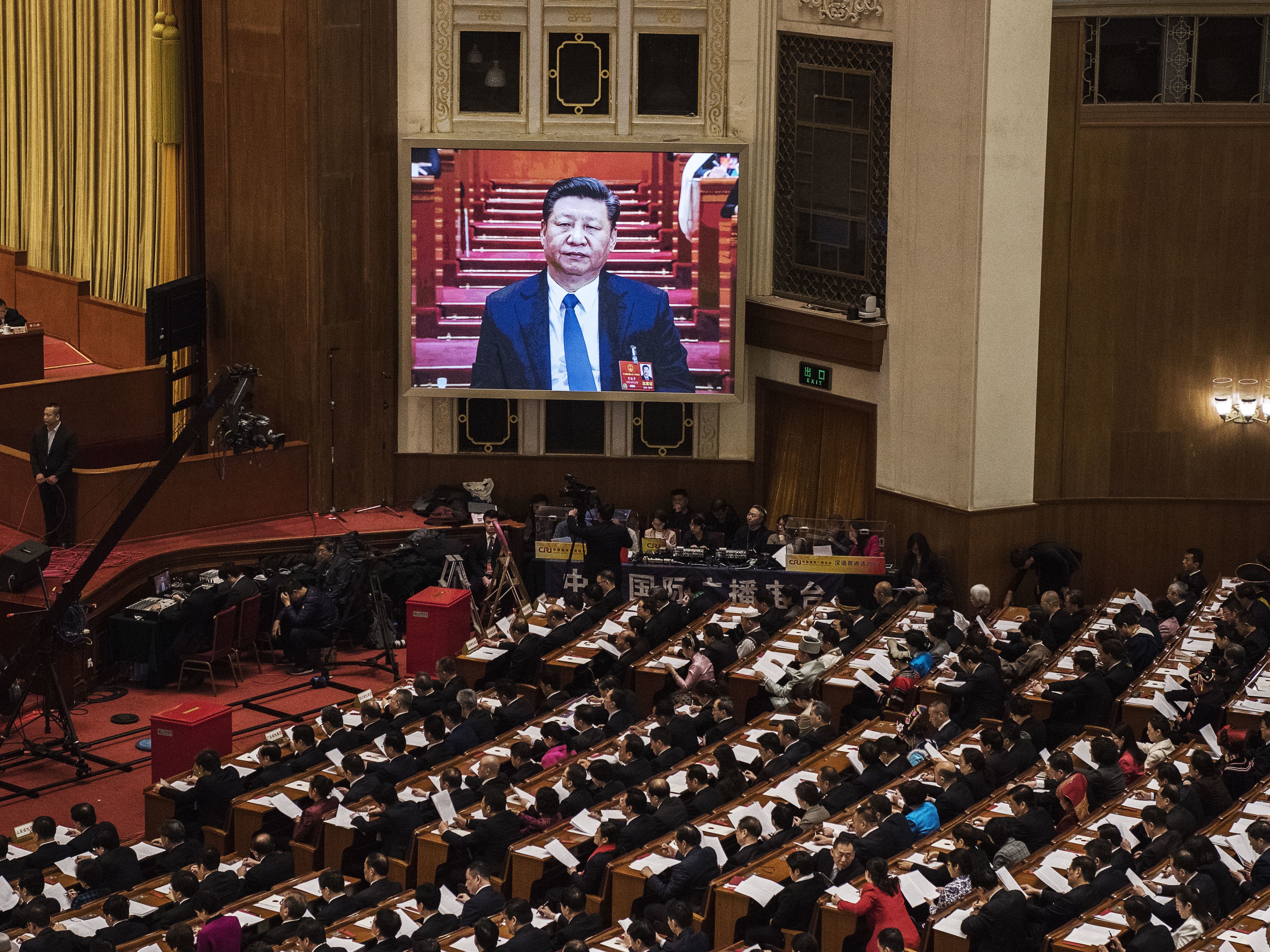China's President Xi Jinping is seen on a large screen over delegates as he joins a session of the National People's Congress to vote on a constitutional amendment March 11. Chinese lawmakers abolished presidential term limits and paved the way for Xi Jinping to rule indefinitely. (Getty Images)