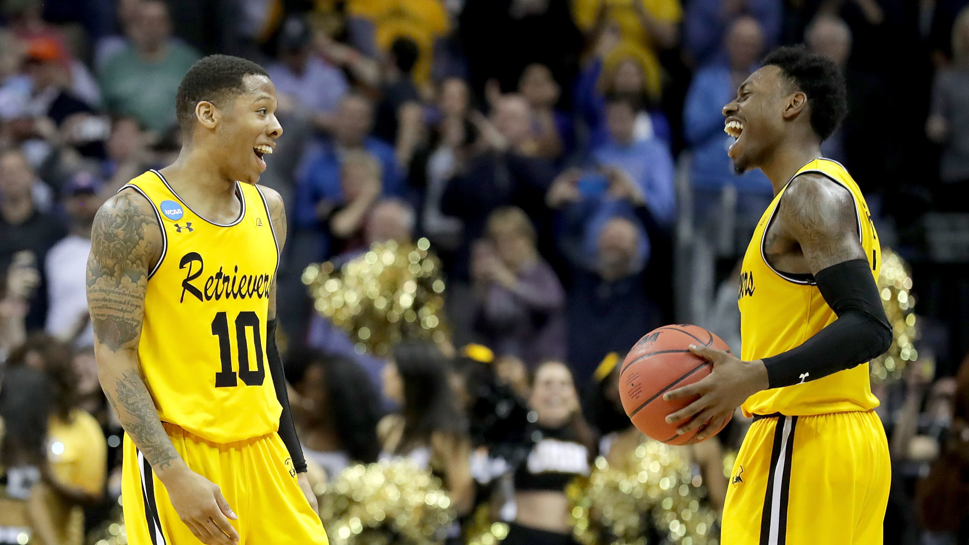 Support WBURUMBC's Retrievers Put Virginia In A Hole, Then Buried Every Single BracketMarch 16, 2018Christopher Dean HopkinsfacebookEmailJairus Lyles, left, and teammate Jourdan Grant of the UMBC Retrievers react Friday night to their 74-54 victory over the Virginia Cavaliers in Charlotte, N.C. (Getty Images)