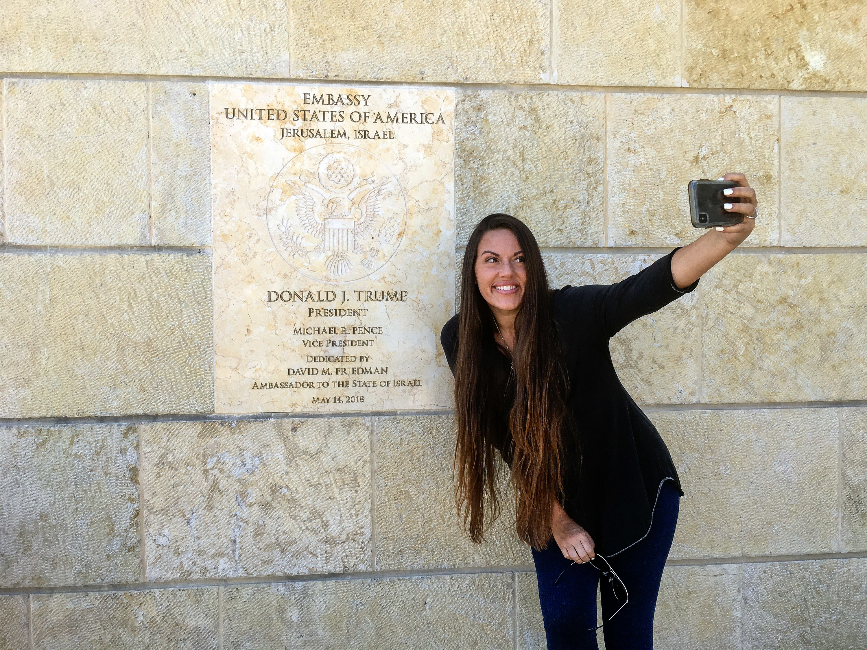Support WBURFor Some Americans, Jerusalem's Newest Pilgrimage Site Is The U.S. EmbassyPlay04:32Download AudioDaniel EstrinOctober 10, 2018 ShareBeckah Shae, a Nashville-based singer-songwriter popular on Christian radio, snapped selfies with the dedication plaque outside the U.S. Embassy to Israel in Jerusalem. (NPR)