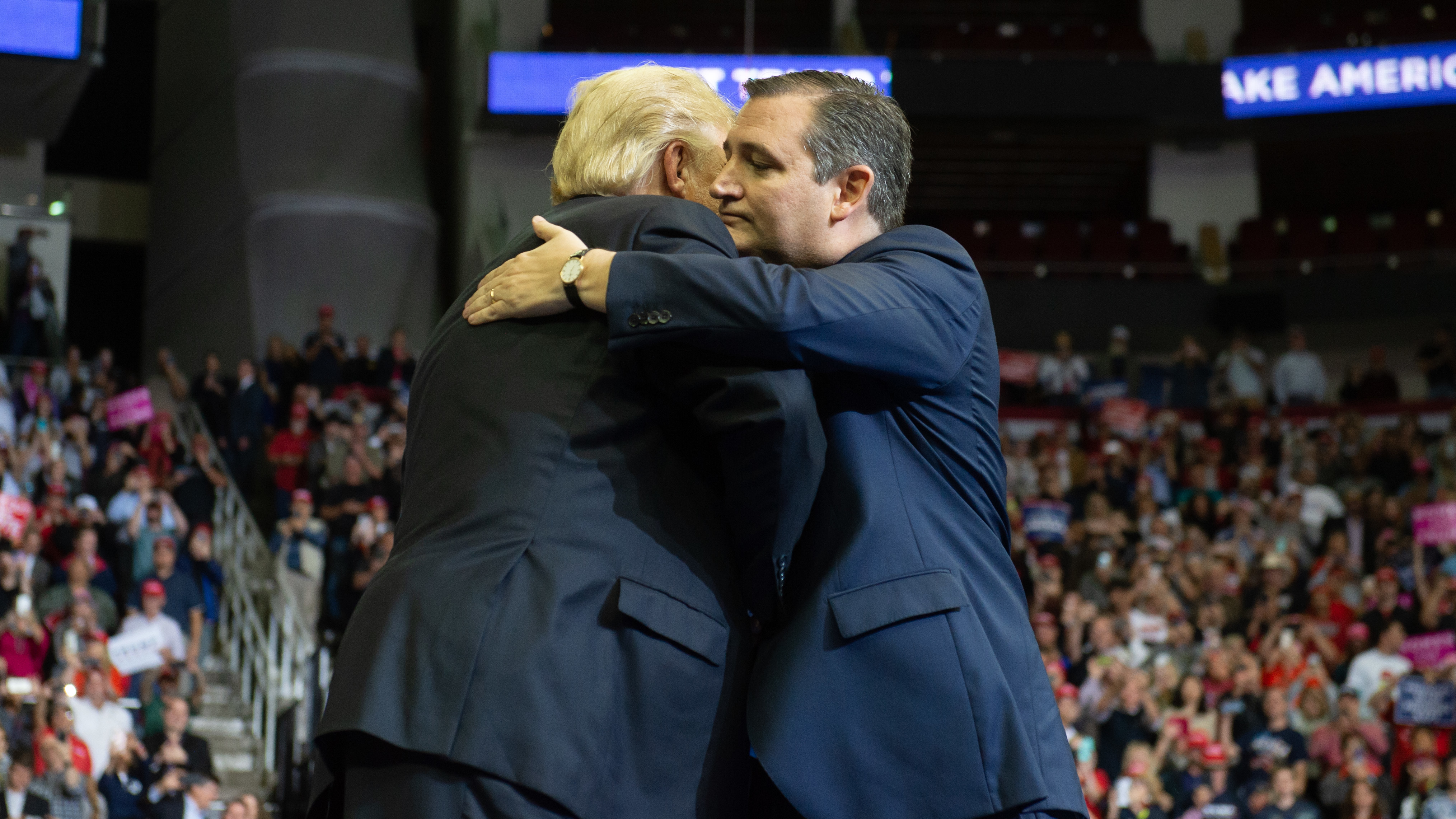 Support WBURAnalysisFrom 'Lyin' Ted' To 'Beautiful': How Trump And Cruz Found Political LoveOctober 22, 2018Domenico MontanarofacebookEmailPresident Trump and Sen. Ted Cruz, once political combatants, embrace at a rally in Houston on Monday. "You know, we had our little difficulties," Trump said for the crowd. "It got ugly. ... But nobody has helped me more." (AFP/Getty Images)
