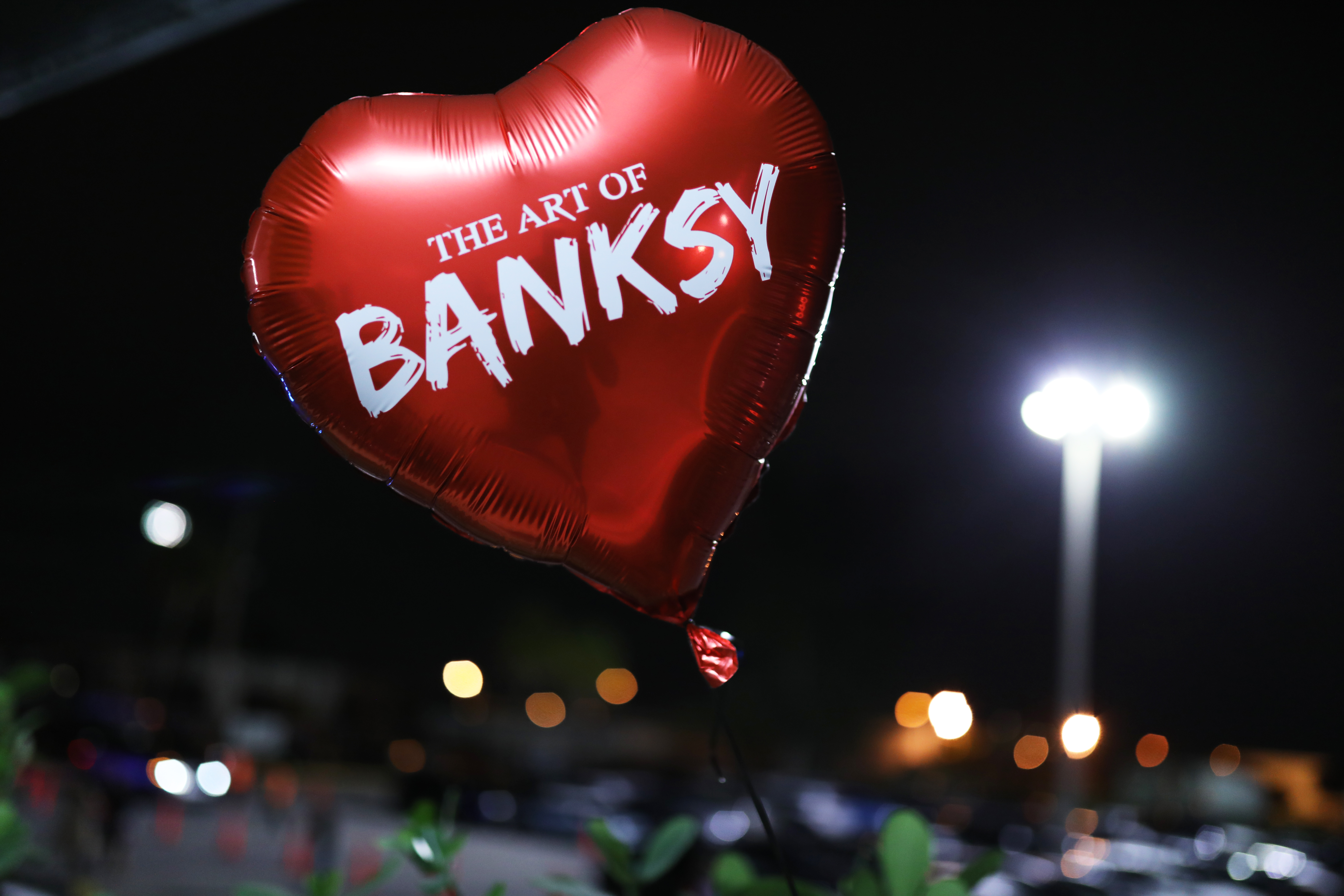 Support WBURThis Art Show Doesn't Have Banksy's Blessings — His Fans Don't Seem To MindPlay03:55Download AudioGreg AllenDecember 06, 2018 ShareA promotional balloon — styled after the red, heart-shaped balloon in one of Banksy's famous artworks — floats at the grand opening of The Art Of Banksy show in Miami. (WorldRedEye.com)