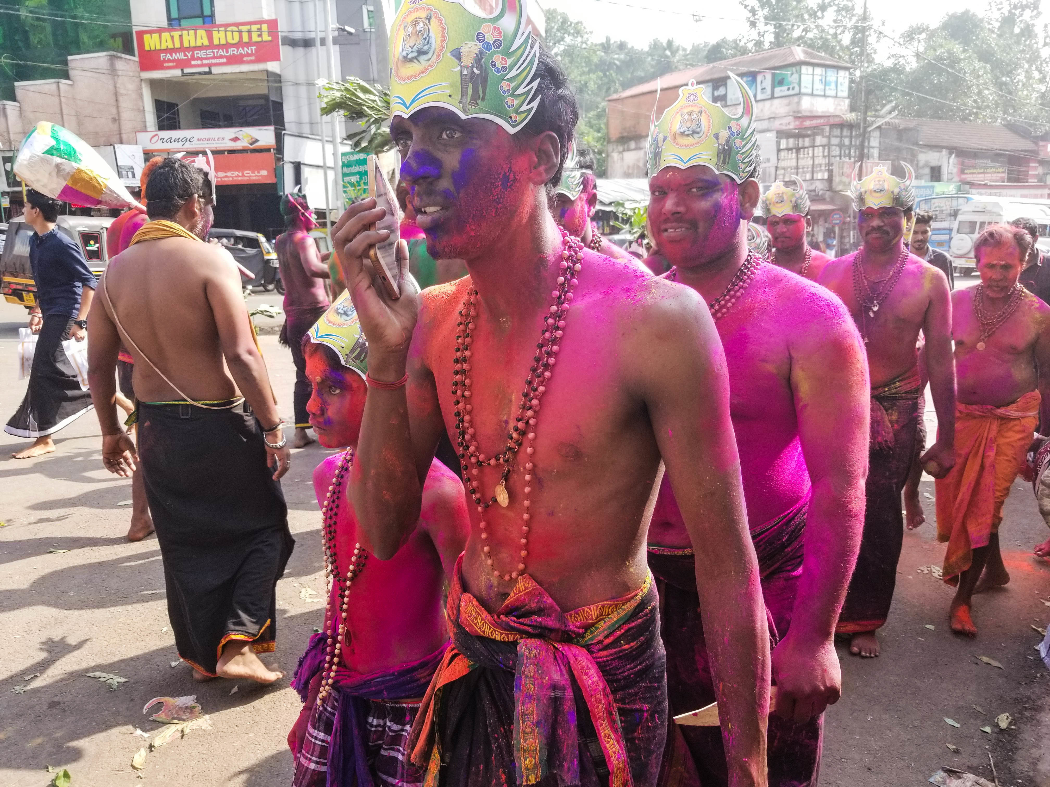 Male pilgrims with painted faces and wearing sarongs and beads walk through the streets in Erumely, on the pilgrimage route to the Sabarimala temple in southern India. Men of all ages are allowed to visit the temple, but women between the ages of 10 and 50 had been banned. (Lauren Frayer/NPR)