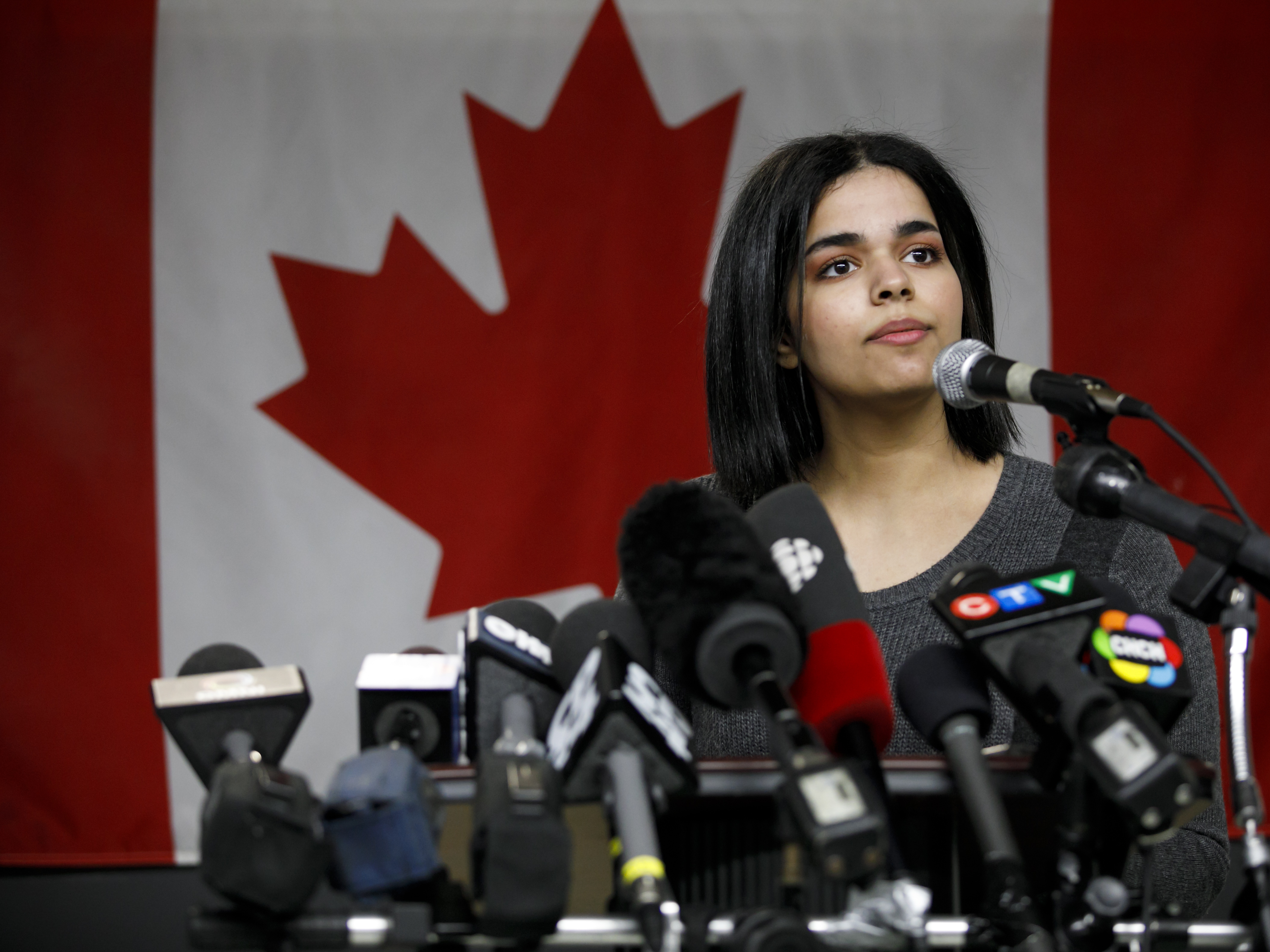 Rahaf Mohammed Alqunun, 18, addresses the media during a news conference at a refugee resettling agency in Toronto on Jan. 15. She pledged to "work in support of freedom for women around the world, the same freedom I experienced on the first day I arrived in Canada." (AFP/Getty Images)