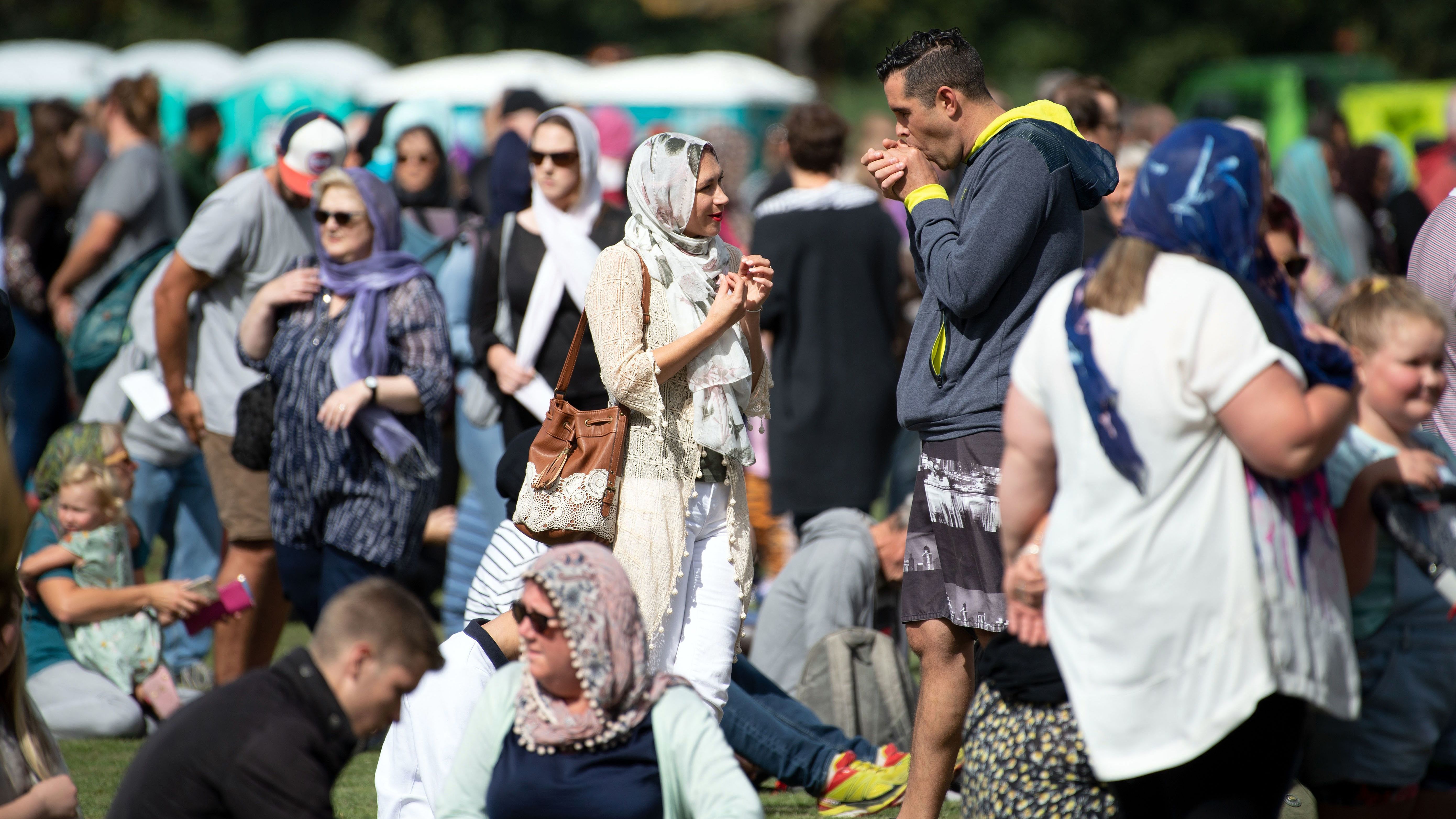 Women wore headscarves as they gathered for the Muslim call to prayer in Hagley Park in Christchurch on Friday. The call was broadcast across New Zealand in memory of 50 people who were killed in attacks at two mosques last Friday. (AFP/Getty Images)
