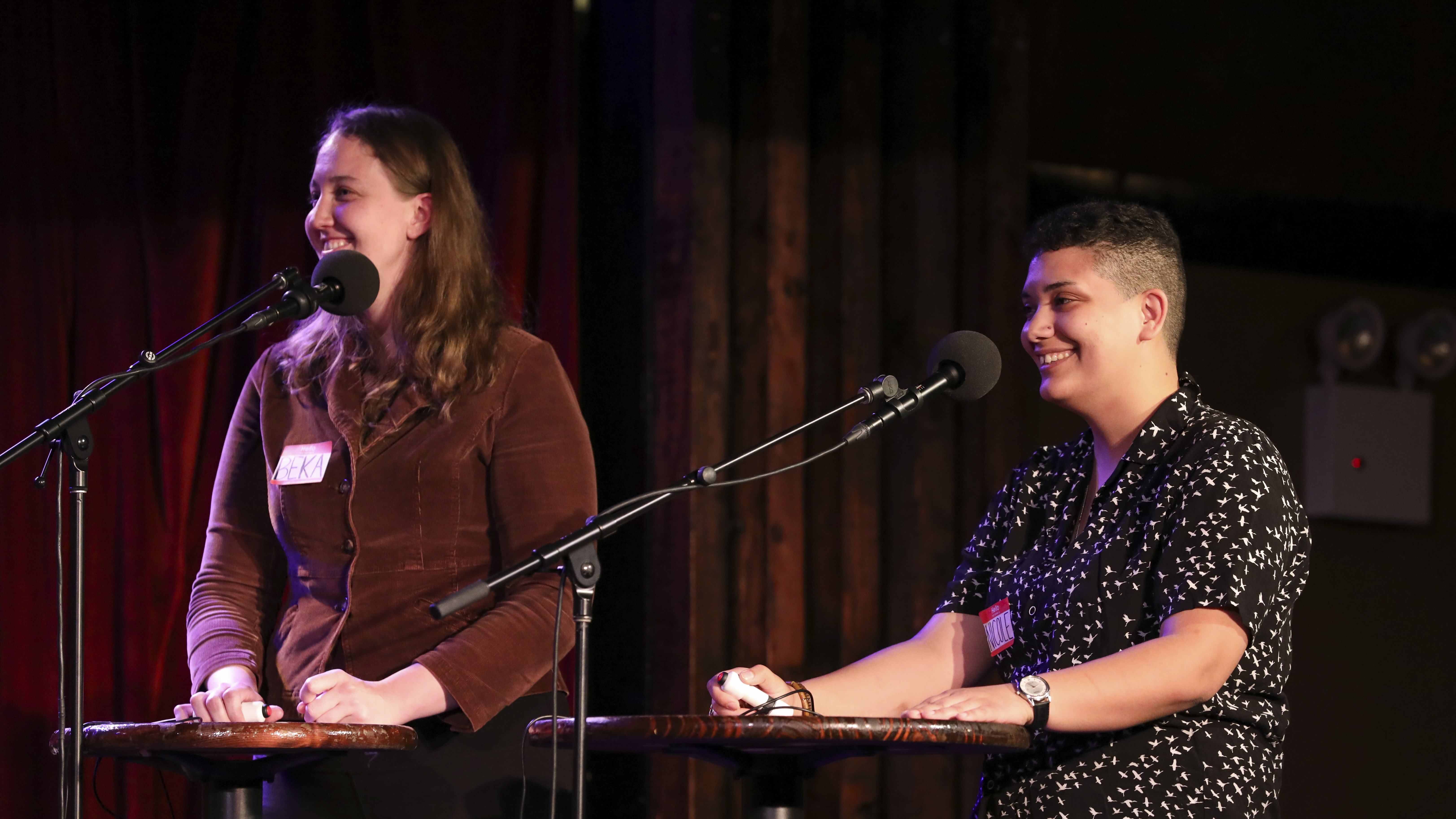Support WBURBook-To-Movie AdaptationsPlay03:21Download AudioMay 03, 2019 ShareContestants Beka Stecky and Nicole Pometti appear on Ask Me Another at the Bell House in Brooklyn, New York (NPR)