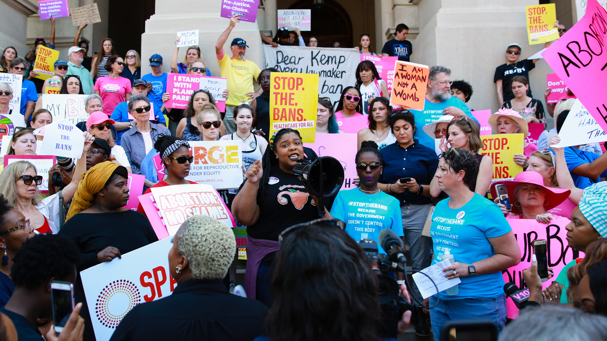 The ACLU, Planned Parenthood and several abortion providers in Georgia are asking a federal court to stop the state's new abortion restrictions from taking effect. Here, a woman is seen during protests last month after Gov. Brian Kemp signed the bill. (Getty Images)