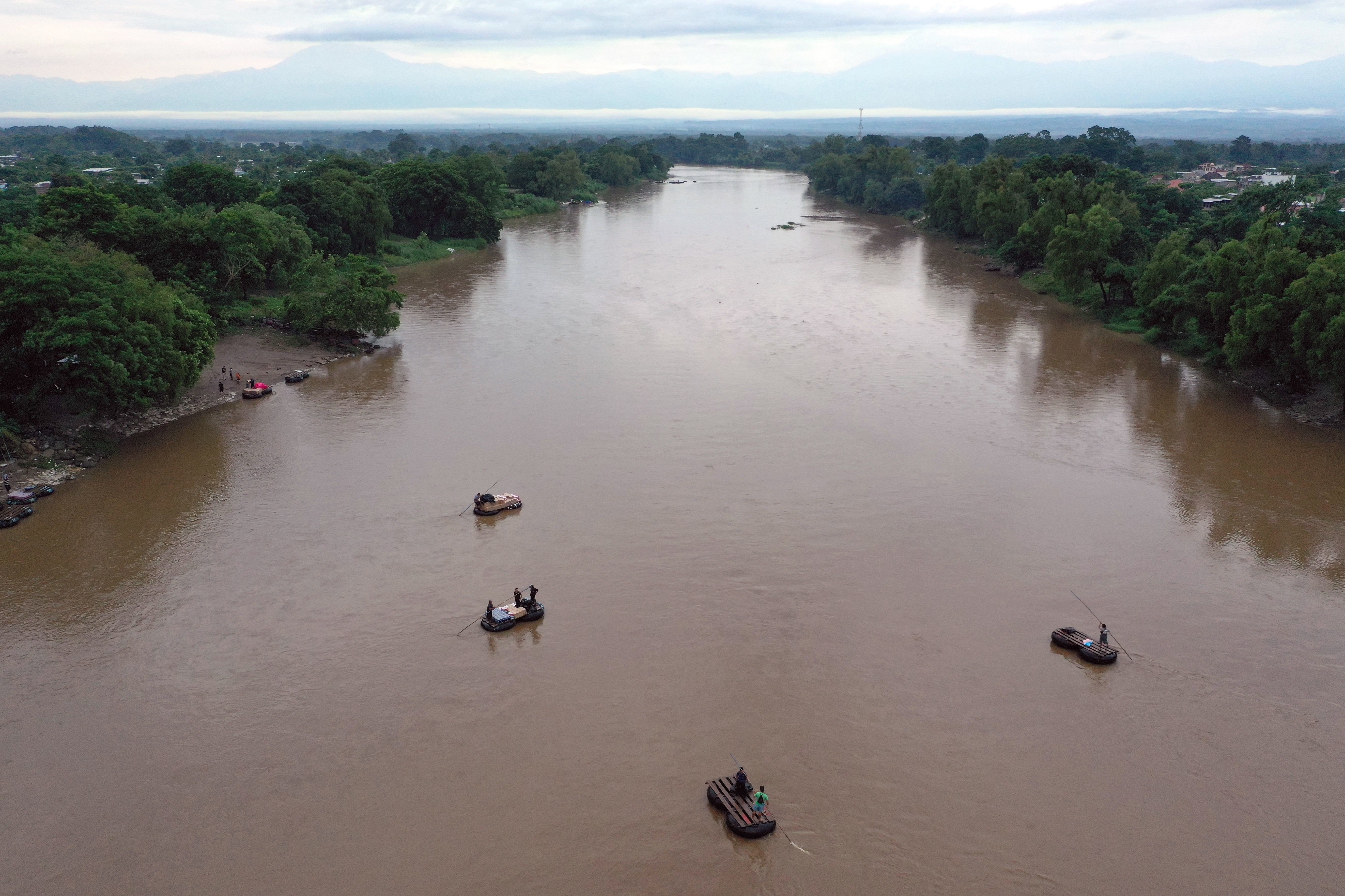 Guatemalan migrants use makeshift rafts to cross the Suchiate River from Tecun Uman in Guatemala to Ciudad Hidalgo in Chiapas State, Mexico, on Monday. In an effort to pressure Guatemala to reduce migration, the Trump administration is planning punitive measures against the country. (AFP/Getty Images)