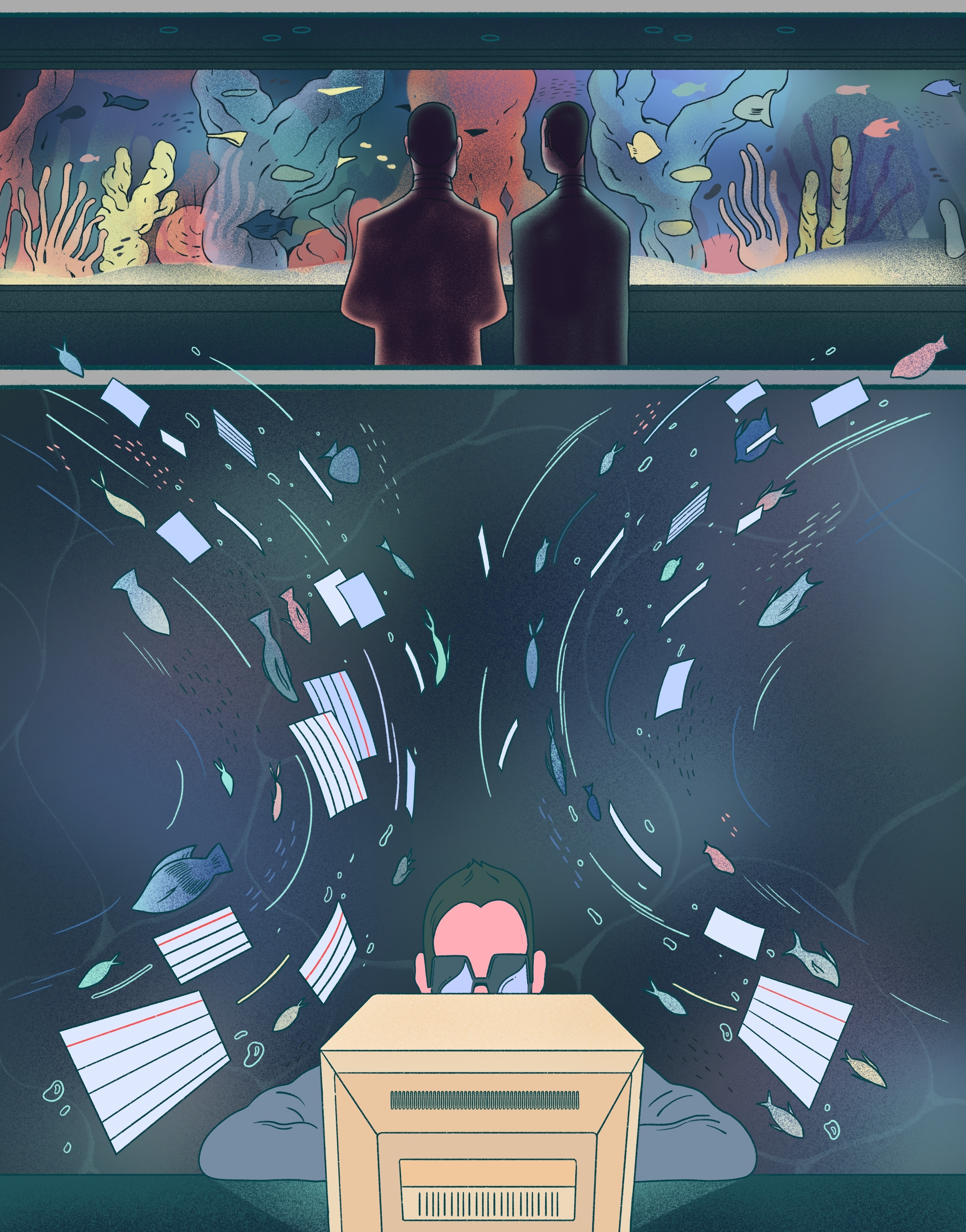 Jeff Jonas sits at a computer, creating software that not only tracked the fish from The Mirage but allowed the casino to make better decisions about how it stocked the tank. Eventually, this system would become known as Non-Obvious Relationship Awareness — NORA. (Olivia Fields for NPR)