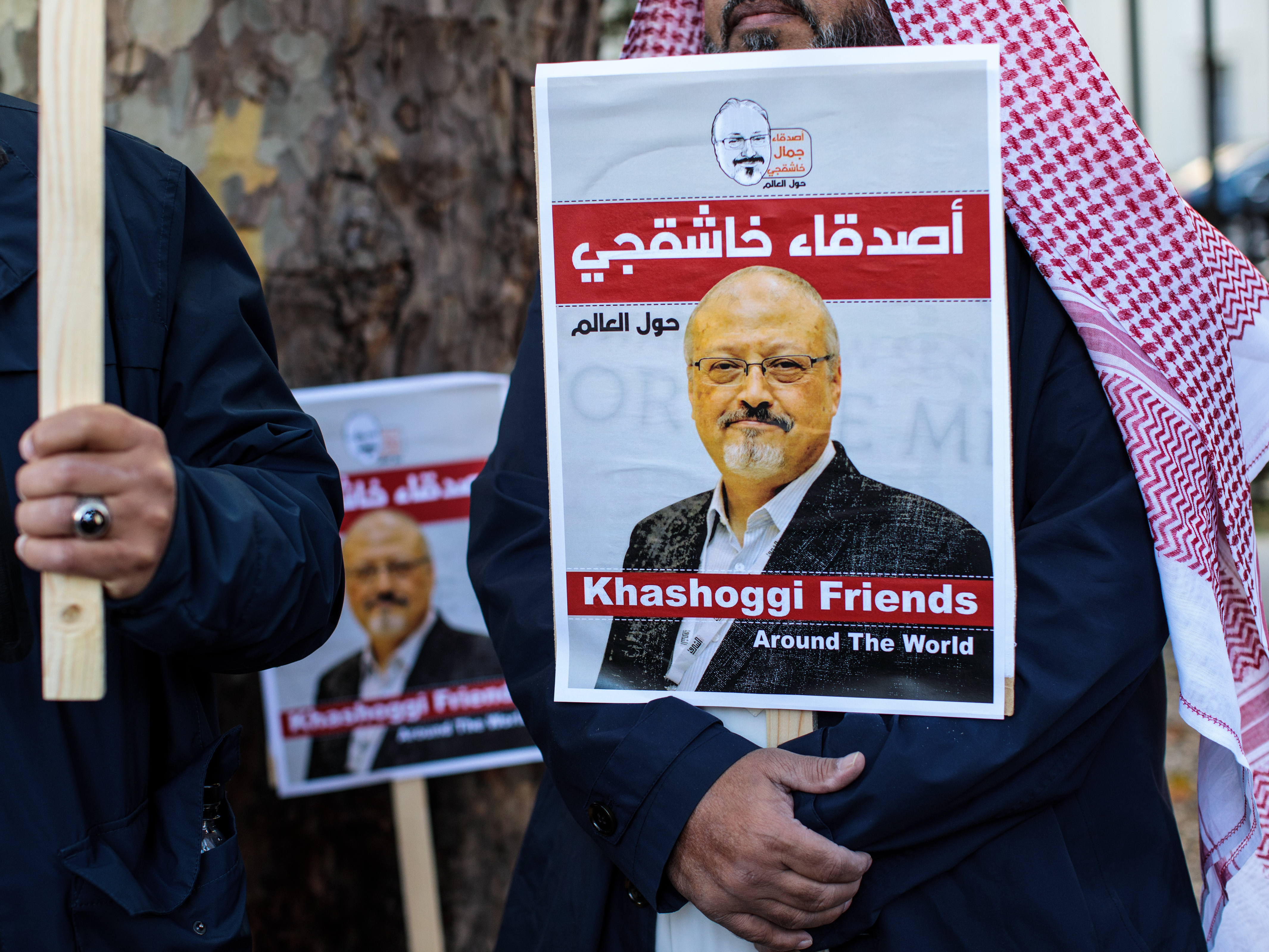Protesters outside the Saudi Arabian Embassy in London in October 2018 demonstrate against the killing of journalist Jamal Khashoggi. On Monday, five people were sentenced to death for the killing, and three others received prison sentences. (Getty Images)