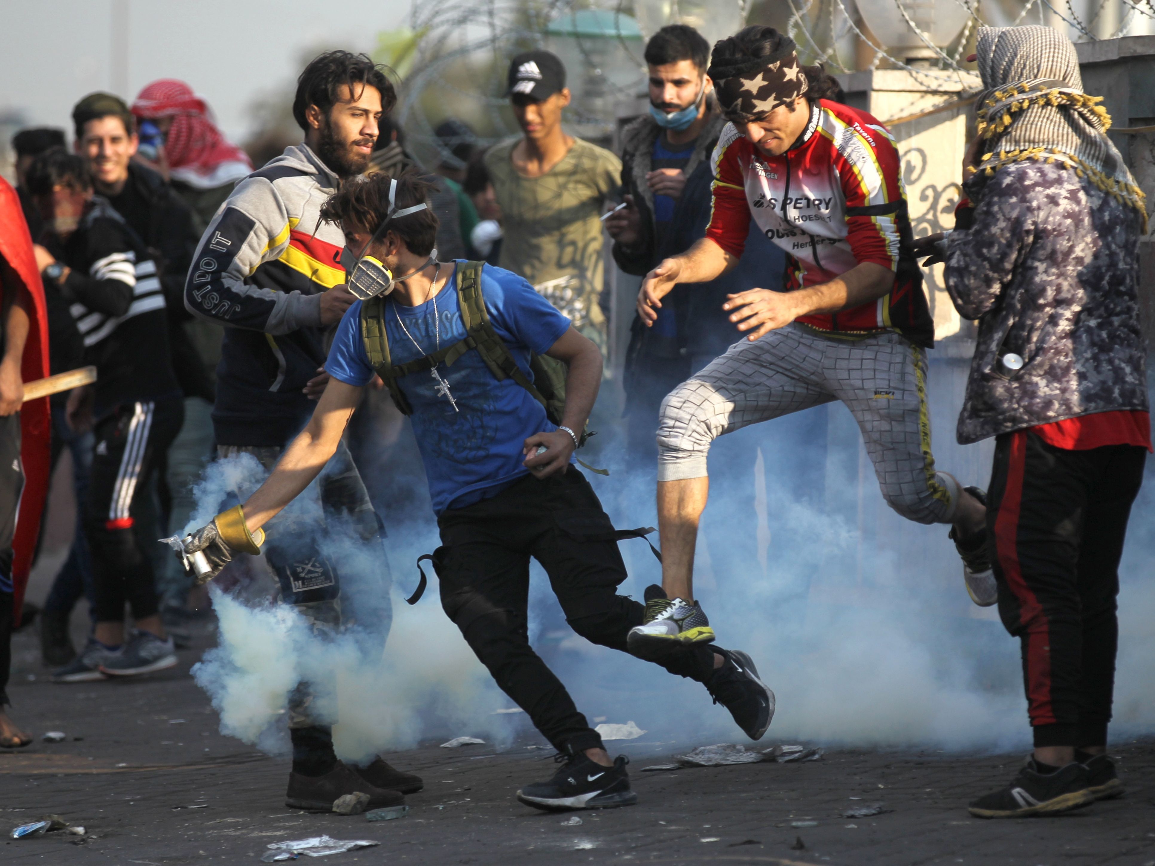 Support WBUR'We Are Not Going To Leave': Iraq's Protests EscalatePlay04:09Download AudioJane ArrafJanuary 22, 2020 ShareAn Iraqi protester grabs a tear gas canister fired by riot police amid clashes following a demonstration east of Tahrir Square, on Monday. (AFP via Getty Images)