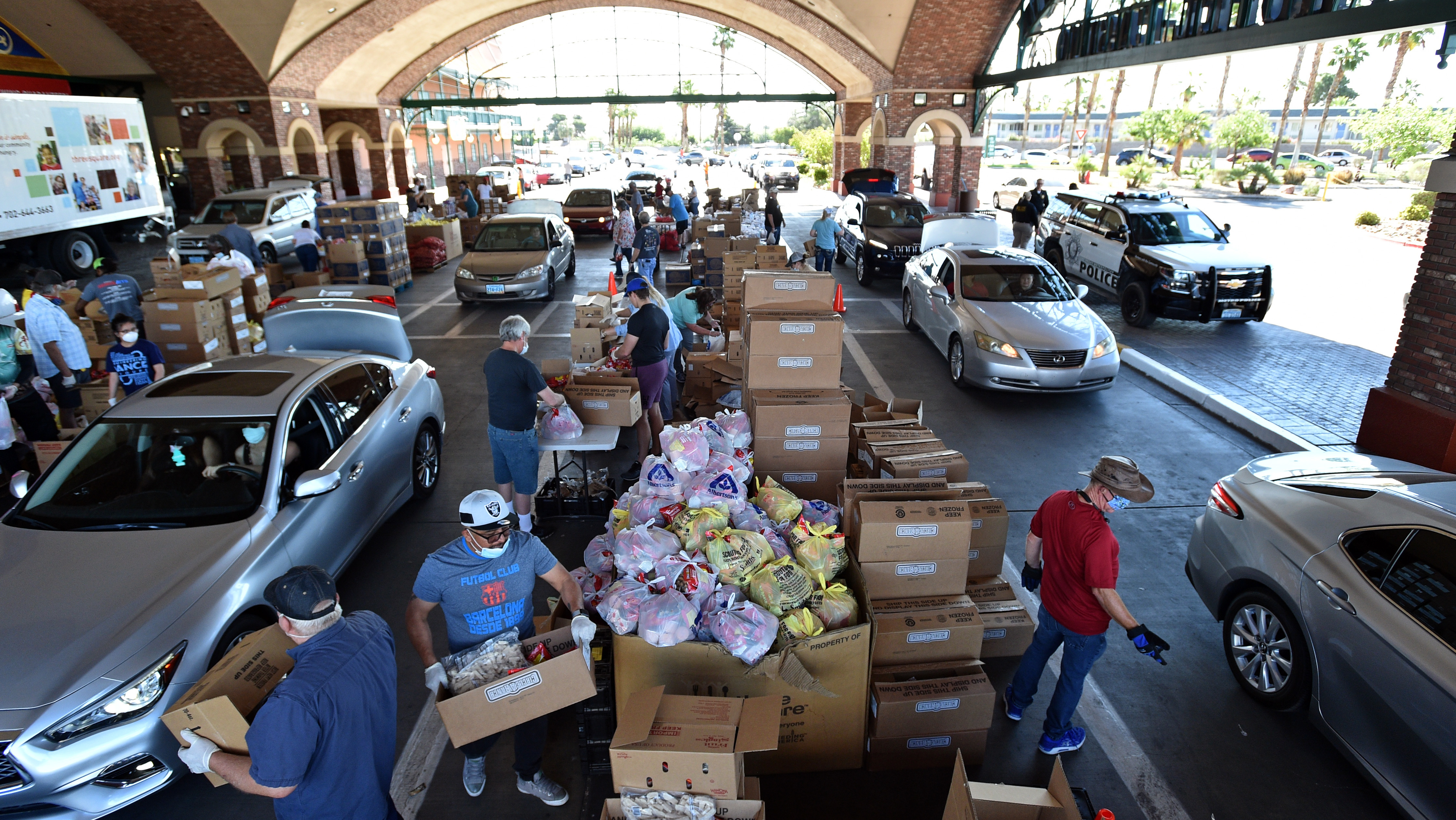 Volunteers give out groceries at a drive-thru Three Square Food Bank emergency food distribution site in Las Vegas in response to increasing demand amid the coronavirus pandemic. (AFP via Getty Images)