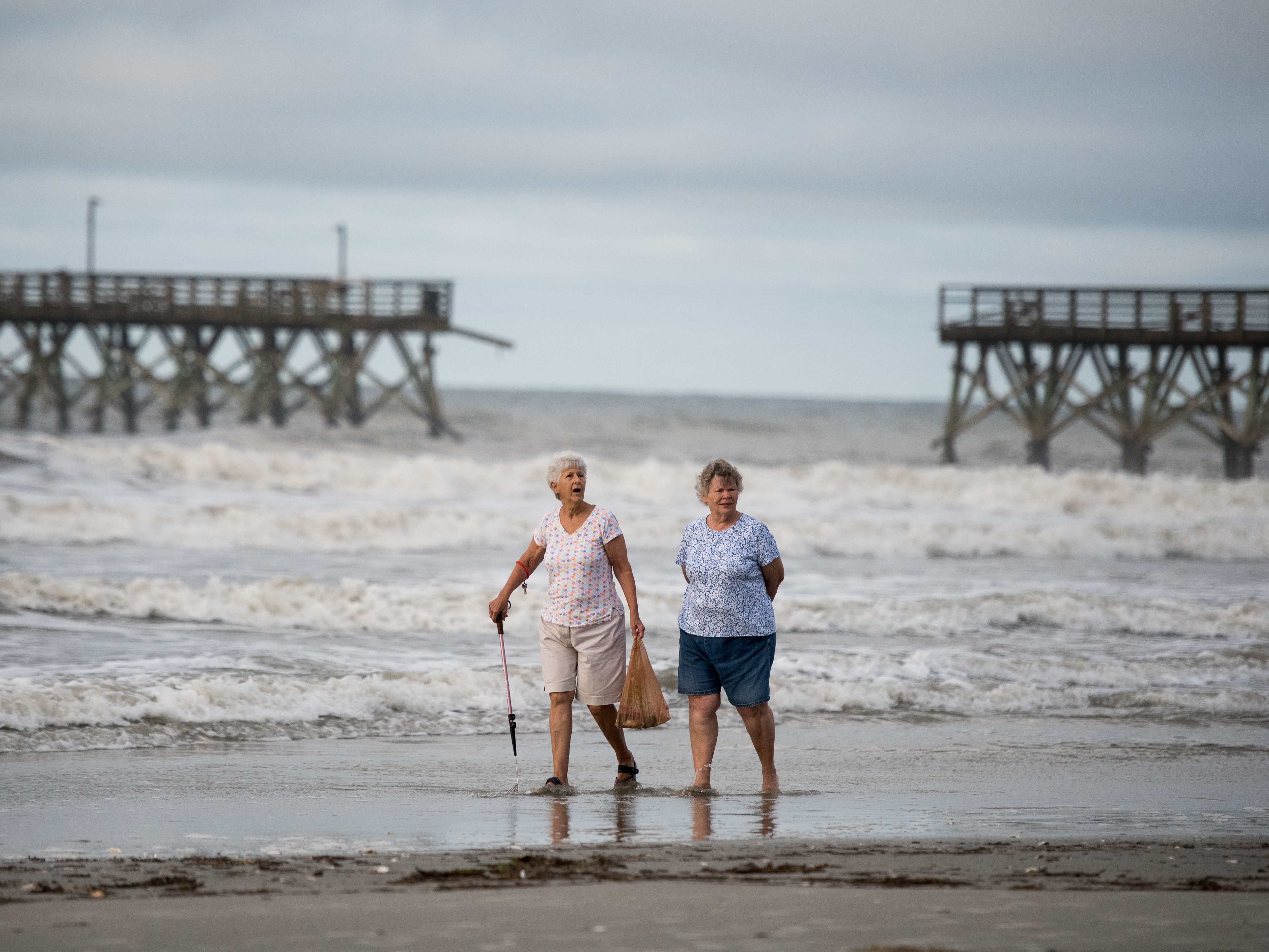 Mary McCants (left) and Amy Garrett walk near a damaged pier the morning after Hurricane Isaias came through late Monday night in North Myrtle Beach, S.C. Hurricane Isaias was downgraded to a tropical storm Tuesday after making landfall overnight as a Category 1 hurricane in North Carolina. (Getty Images)