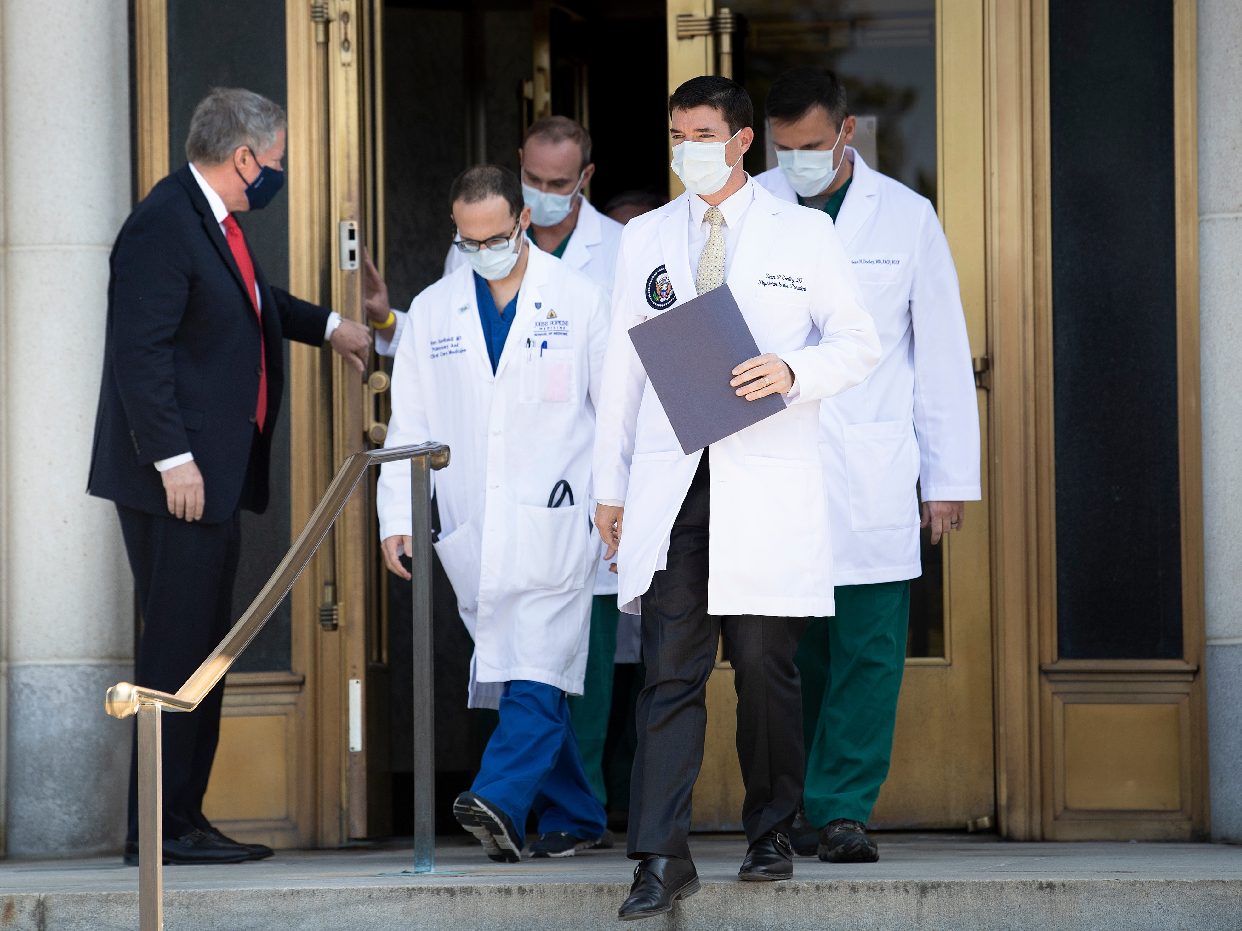 Support WBURWhite House Struggles To Explain, Contain Its Own Spiraling COVID-19 CrisisOctober 05, 2020Ayesha RascoeTamara KeithFranco OrdoñezJuana SummersMara LiassonfacebookEmailWhite House chief of staff Mark Meadows holds the door for Dr. Sean Conley and other members of the president's medical team on Sunday. Another update on Trump's condition is expected sometime on Monday. (AFP via Getty Images)