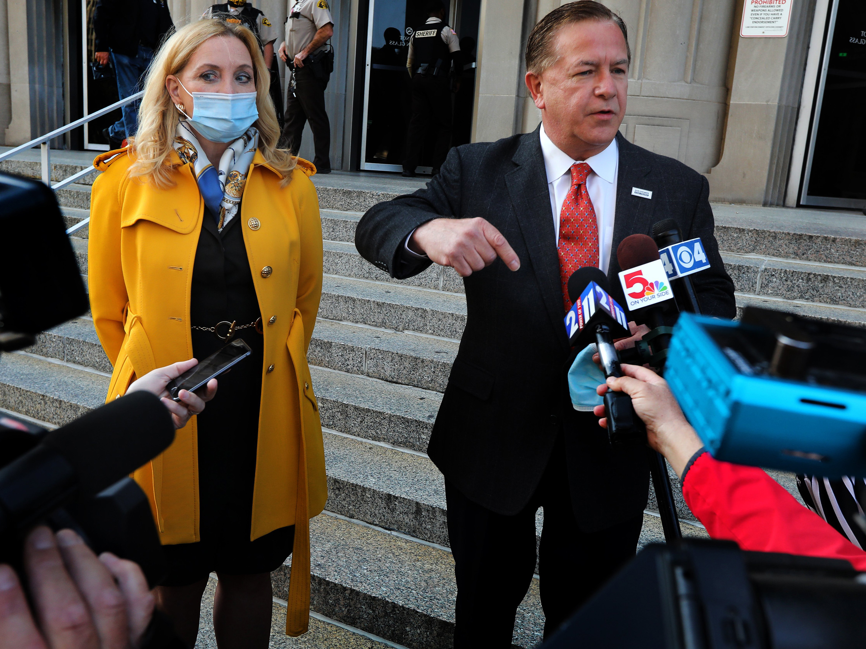 "The government chooses to persecute us for doing no more than exercising our right to defend ourselves, our home, our property and our family," said Mark McCloskey, alongside his wife Patricia on Tuesday outside the Carnahan Courthouse. (TNS via Getty Images)