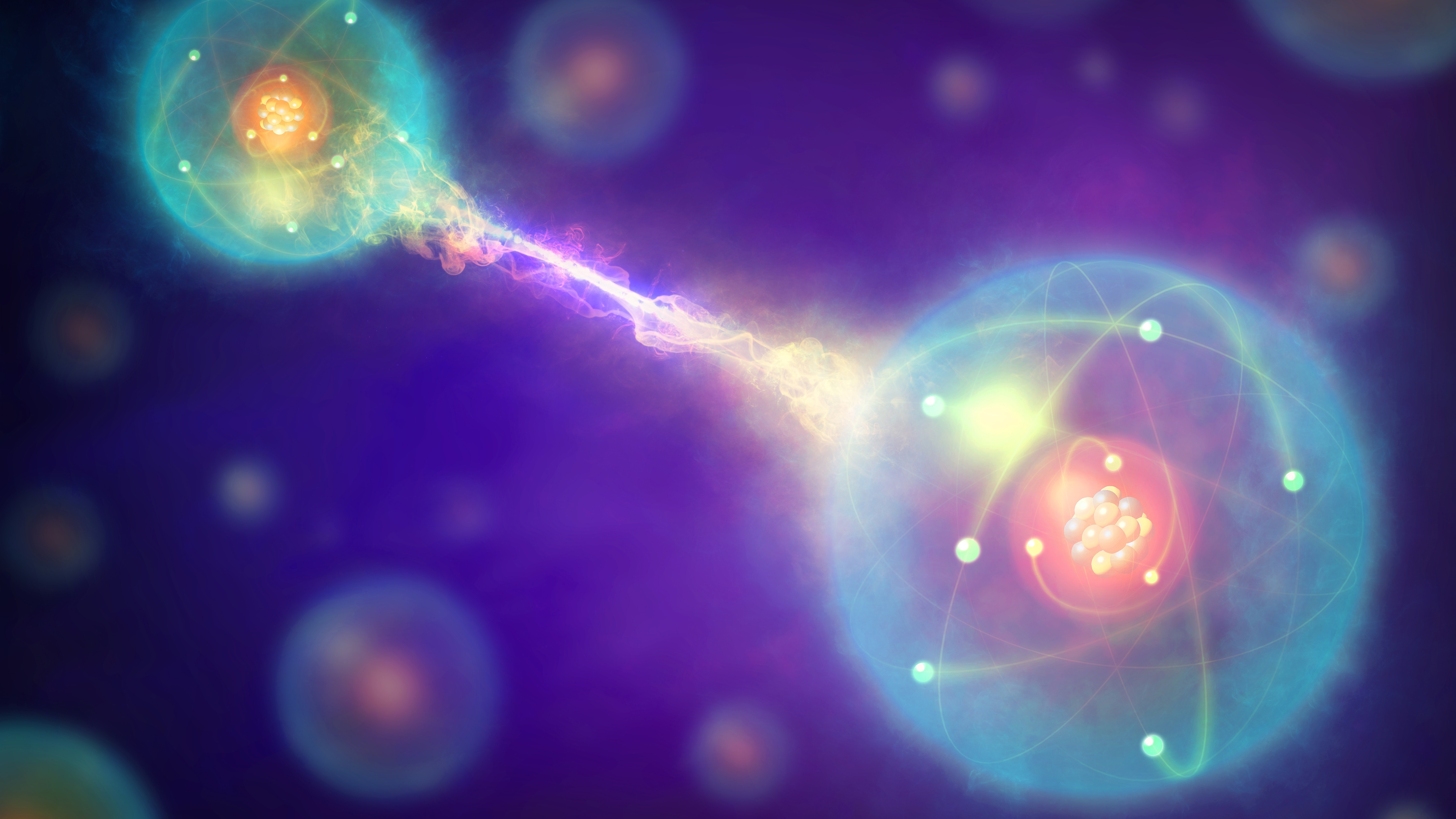 Conceptual artwork of quantum entanglement, one of the consequences of quantum theory. Two particles will appear to be linked across space and time, with changes to one of the particles (such as an observation or measurement) affecting the other one. (Getty Images/Science Photo Libra)