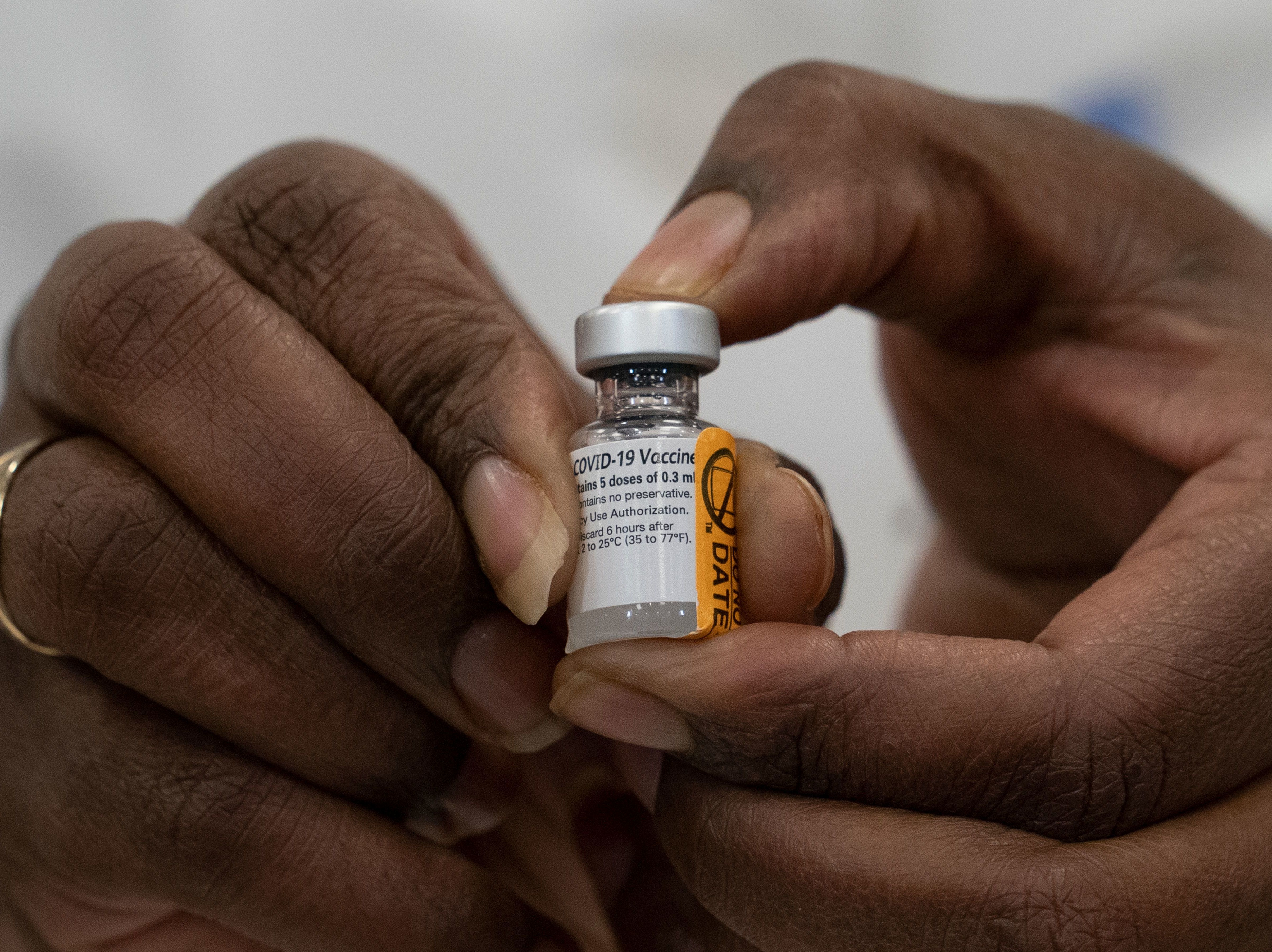 Dr. Michelle Chester holds a vial of the COVID-19 vaccine at Long Island Jewish Medical Center on Monday. The rollout of the Pfizer and BioNTech vaccine, the first to be given emergency use authorization by the Food and Drug Administration, ushers in the biggest vaccination effort in recent U.S. history. (POOL/AFP via Getty Images)