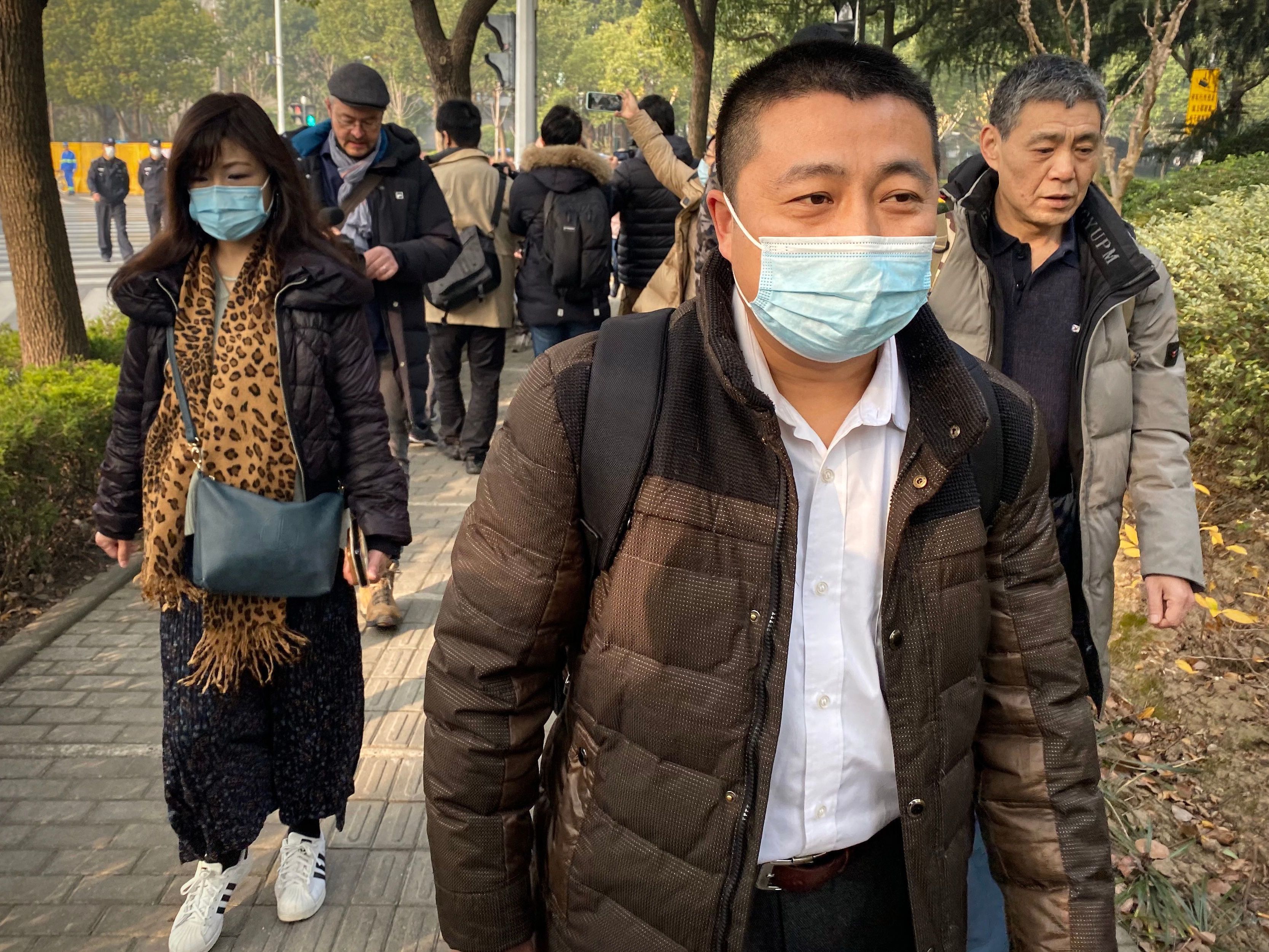 Lawyer Ren Quanniu (center), representing Chinese citizen journalist Zhang Zhan who reported on Wuhan's COVID-19 outbreak and was placed in detention since May, arrives at the Shanghai Pudong New District People's Court where Zhang is set for trial in Shanghai on Dec. 28. Ren has since been disbarred. (AFP via Getty Images)