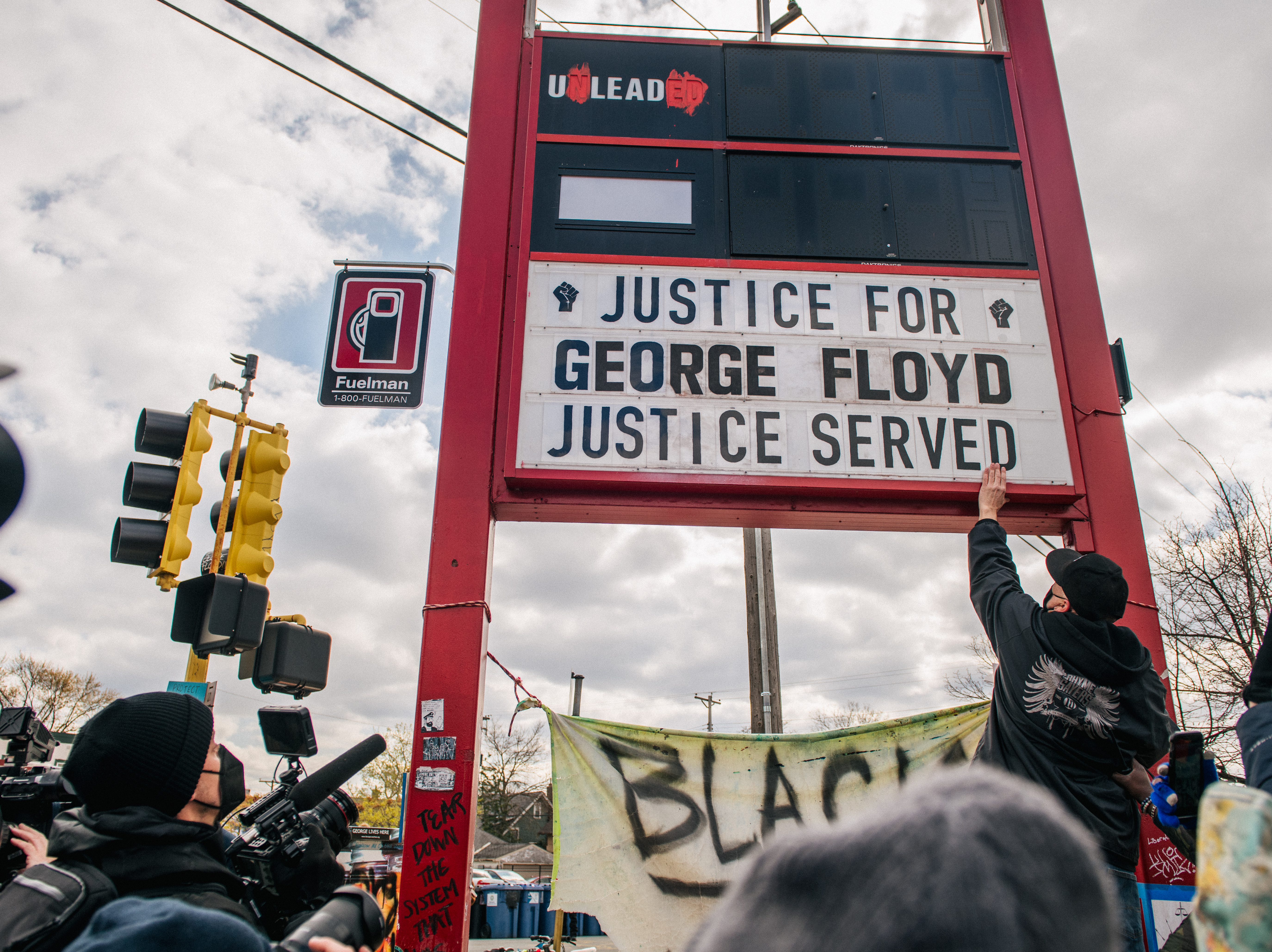 People celebrate the guilty verdict in the Dereck Chauvin trail in Minneapolis. Chauvin, a former Minneapolis police officer was found guilty of all three charges in the killing of George Floyd. (Getty Images)