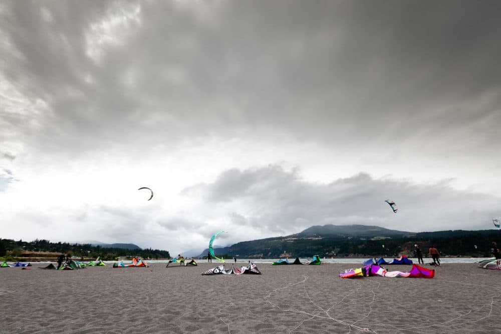 "We're right smack dab in the middle of the Cascade Range which runs north-south," he says. "And the Columbia River happens to be this east-west cut through the Range. And so in the summertime, the desert floor heats up, and the warm air, of course, rises. And as the warm air rises off of the desert floor it then has the effect of pulling the cool marine air from the west to the east. So this is what creates the famous gorge west winds in the summertime."