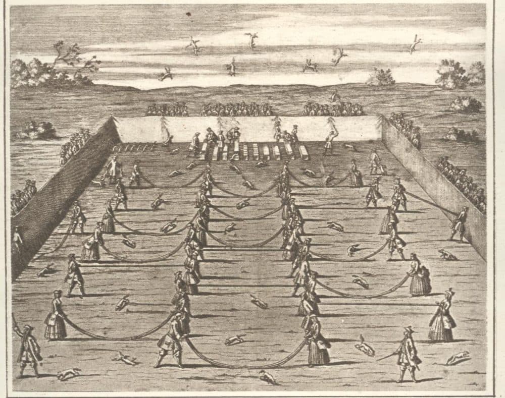 EBH: Fox tossing was the sport that I found and then spawned the idea of the book. And, it was hidden away in a German hunting manual from 1720. And in between this Gothic text was a bizarre image of German aristocrats, dressed up in their wigs and finery, standing in an arena a bit like a grass tennis court, divided into couples, mixed couples, and they held between them a cloth a bit like a badminton net that they lay slack along the ground. And on a signal, foxes — but also badgers and wildcats — were released into this arena. They'd chase each other around and the moment that one stood on this cloth, it was the job of the "tossers" to yank the cloth taut and catapult that animal up into the air as high as possible. And this was called Fuchsprellen, which, depending on which German you'd ask, is fox tossing, fox launching, fox bouncing. And it was the strangest thing I'd ever seen, and so I wondered if there were other similarly bizarre things that had been completely forgotten about.