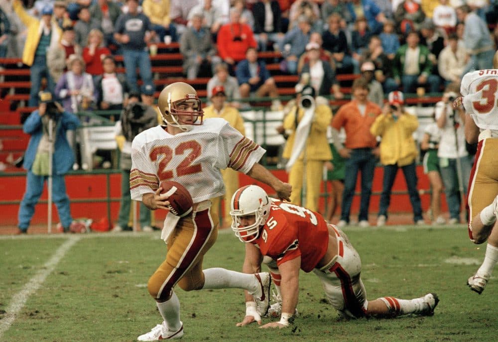 Flutie got it last. But with six seconds left on the clock, time for one more play, B.C., down 4, was barely past the middle of the field. And Flutie used the first few of those six seconds to scramble back to the B.C. 36.