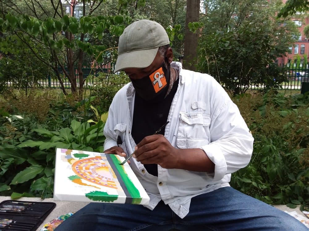 Artist Lloyd Williams has set up a small outdoor gallery next to the Charles River in Boston. His business has struggled in the pandemic. So he’s stepped outside — leaning his artwork up against stone benches as he paints. Wearing a mask with an Ankh — the Egyptian key of life — he strikes up conversations with passers by.