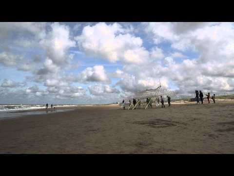 "In 1990 I had this idea to make new forms of life, which have to survive on beaches," says Jansen. "They move on the wind, so they don't have to eat, these animals. This is the big advantage, according to the other animals. They always waste their time looking for food, these animals don't have to do that. And so in the years they became better at surviving the storms and the sand and the water on the beach and I'm in the middle of that process. This summer I was on the beach doing all kinds of experiments with a new animal, then it comes to full, I declare an animal extinct, and then it goes to the boneyard and it becomes a fossil and since a few years these extinct animals are adopted in exhibitions so, what you see here is in fact a beach animal history."